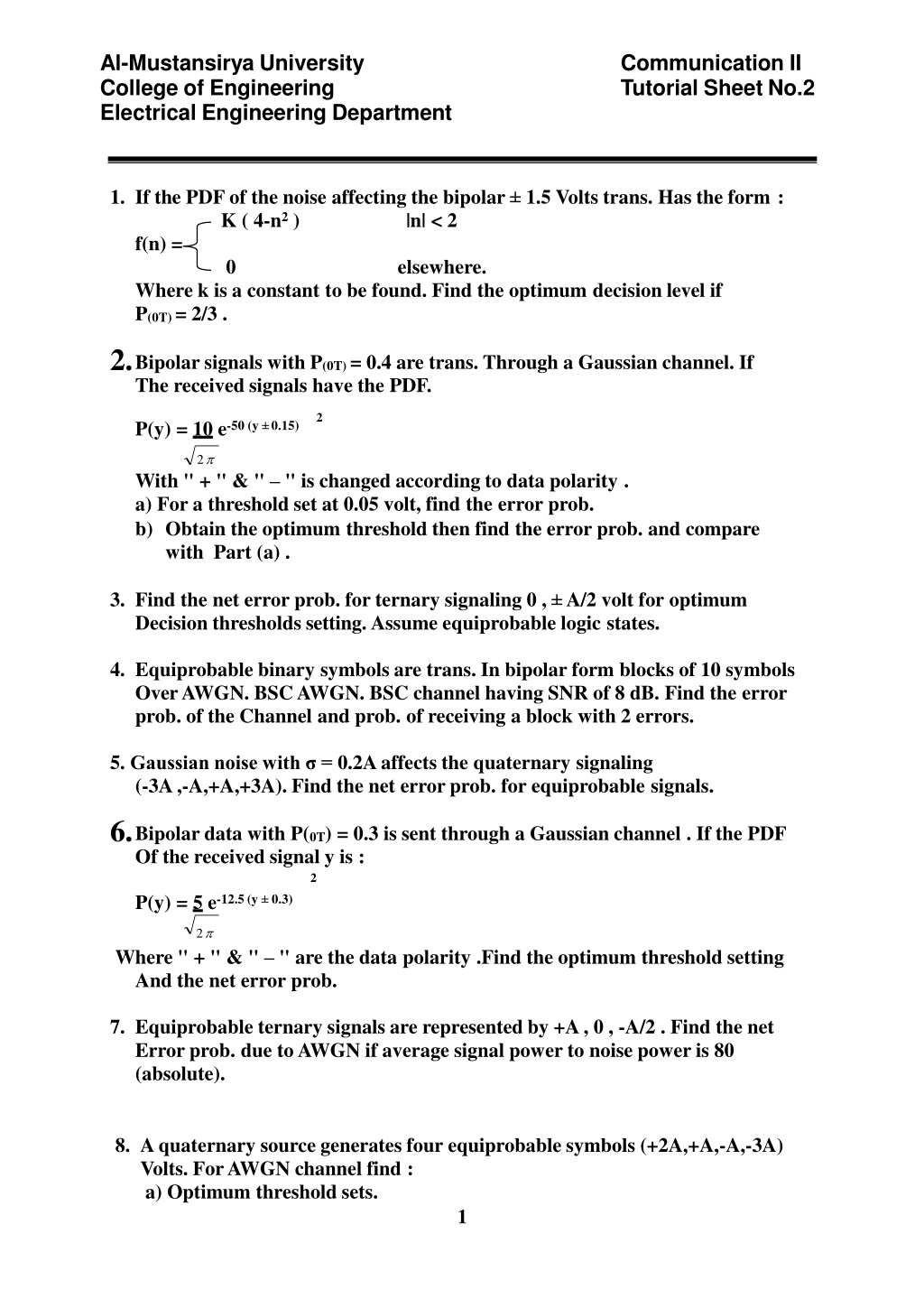 If you're studying electrical engineering with a focus on communication at Al-Mustansirya University, this tutorial sheet covers topics like finding optimum decision levels, error probabilities, net error probabilities, Gaussian channels, AWGN channels, binary and ternary signaling, matched filters, Shannon capacity, and more. Dive into solving problems related to noise-affected signals, thresholds, signal power, bit rate, and more to enhance your understanding of communication systems.