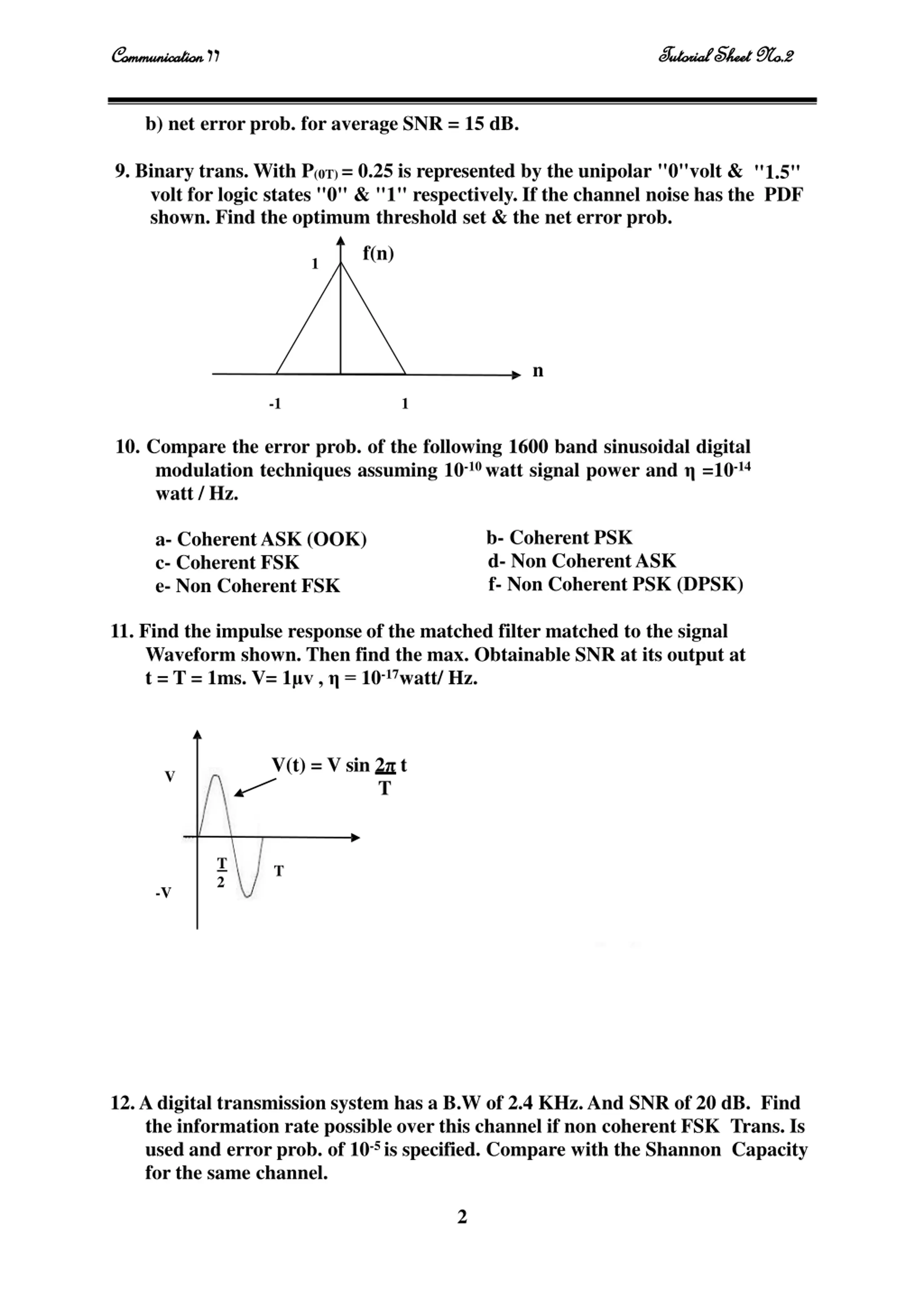 Communication Communication Al-Mustansirya University College of Engineering Electrical Engineering Department Tutorial Tutorial Sheet Communication II Tutorial Sheet No.2 SheetNo. No.2 2 1. If the PDF of the noise affecting the bipolar 1.5 Volts trans. Has the form : K ( 4-n2) |n| < 2 f(n) = 0 elsewhere. Where k is a constant to be found. Find the optimum decision level if P(0T) = 2/3 . 2.Bipolar signals with P(0T) = 0.4 are trans. Through a Gaussian channel. If The received signals have the PDF. 2 P(y) = 10 e-50 (y 0.15) 2 With " + " & " " is changed according to data polarity . a) For a threshold set at 0.05 volt, find the error prob. b) Obtain the optimum threshold then find the error prob. and compare with Part (a) . 3. Find the net error prob. for ternary signaling 0 , A/2 volt for optimum Decision thresholds setting. Assume equiprobable logic states. 4. Equiprobable binary symbols are trans. In bipolar form blocks of 10 symbols Over AWGN. BSC AWGN. BSC channel having SNR of 8 dB. Find the error prob. of the Channel and prob. of receiving a block with 2 errors. 5. Gaussian noise with = 0.2A affects the quaternary signaling (-3A ,-A,+A,+3A). Find the net error prob. for equiprobable signals. 6.Bipolar data with P(0T) = 0.3 is sent through a Gaussian channel . If the PDF Of the received signal y is : 2 P(y) = 5 e-12.5 (y 0.3) 2 Where " + " & " " are the data polarity .Find the optimum threshold setting And the net error prob. 7. Equiprobable ternary signals are represented by +A , 0 , -A/2 . Find the net Error prob. due to AWGN if average signal power to noise power is 80 (absolute). 8. A quaternary source generates four equiprobable symbols (+2A,+A,-A,-3A) Volts. For AWGN channel find : a) Optimum threshold sets. 1