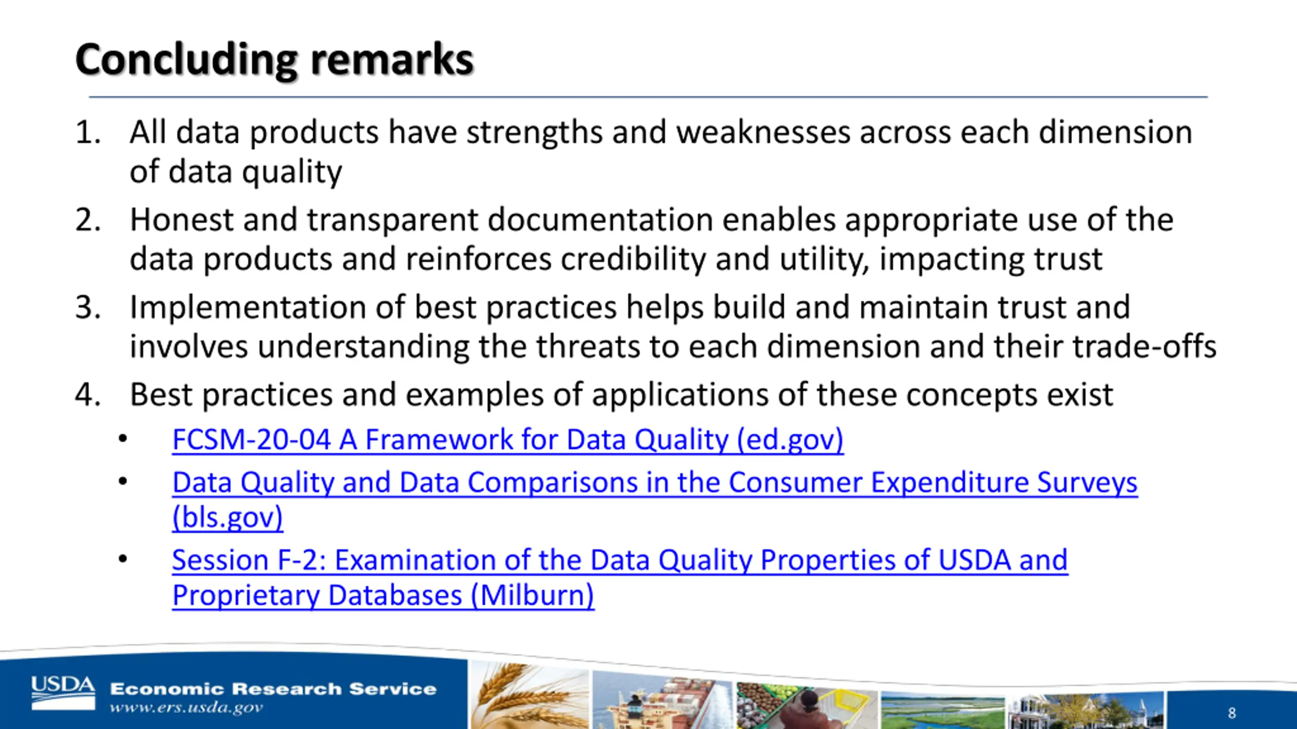 More Fully Capturing Uncertainty Associated with Official Estimates (Young) Brief summary 1. Focus on the accuracy dimension of total survey error and quantifies errors due to sampling, nonresponse, undercoverage, misclassification, and calibration 2. Application to the 2017 Census of Agriculture to improve upon the 2012 methods by incorporating the impact of calibration and rounding in all measures of uncertainty Relevance to themes 1. Communication and transparency about standard error calculations 2. Inaccuracies can impact confidence in the data product and can erode users' trust Additional considerations 1. Models are imperfect characterizations and can be subject to some level of subjectivity, potential conflicts with objectivity as a domain of data quality 2. Accounting for and understanding the relative importance of other sources of uncertainty (e.g., linkage, editing, and imputation) is critical for reducing the overall error 6