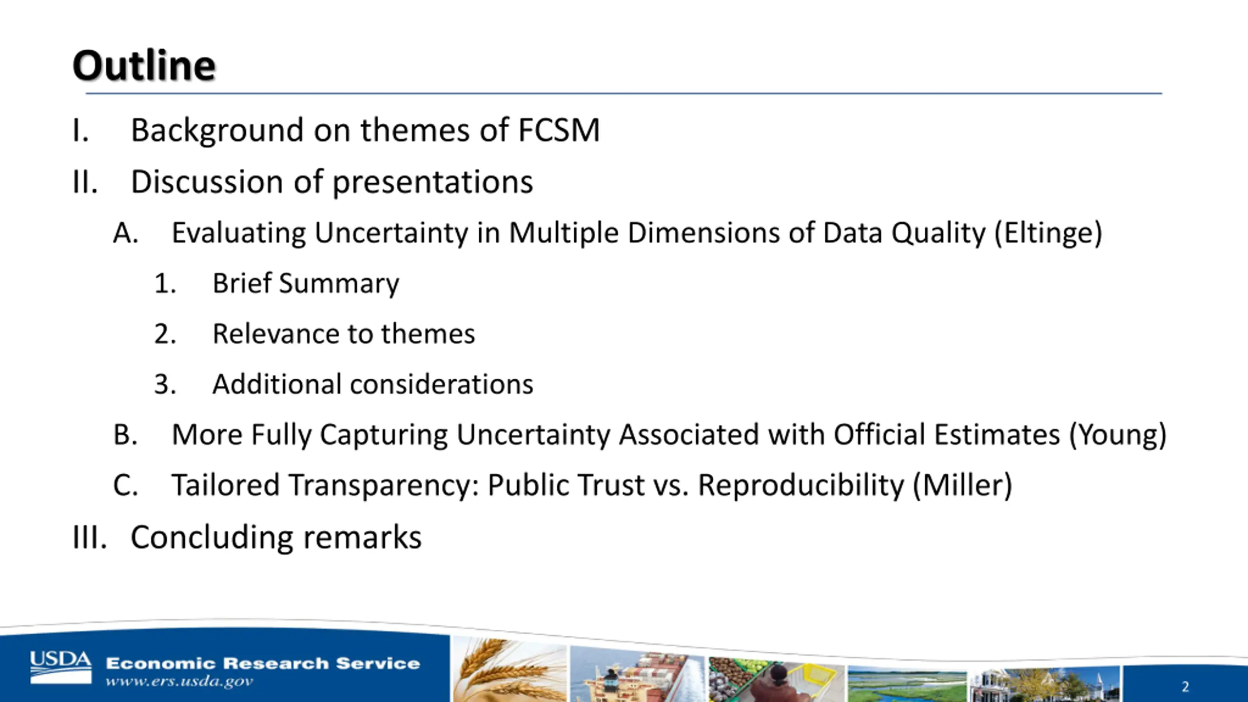 Outline I. II. Discussion of presentations A. Evaluating Uncertainty in Multiple Dimensions of Data Quality (Eltinge) Background on themes of FCSM 1. Brief Summary 2. Relevance to themes 3. Additional considerations B. More Fully Capturing Uncertainty Associated with Official Estimates (Young) Tailored Transparency: Public Trust vs. Reproducibility (Miller) III. Concluding remarks C. 2