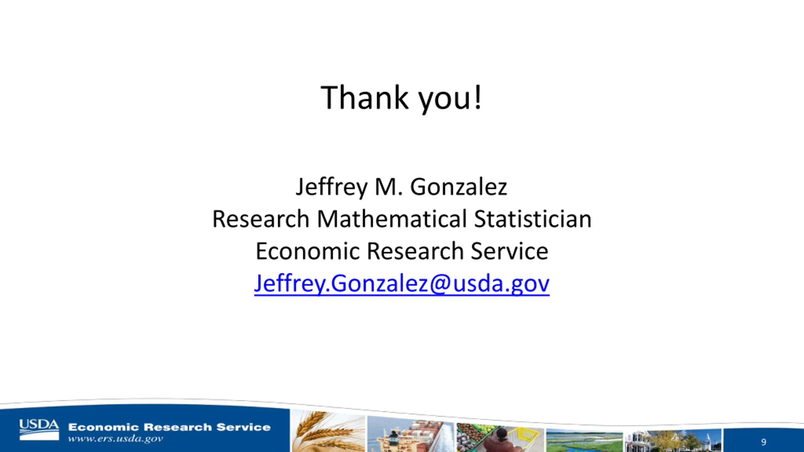Thank you! Jeffrey M. Gonzalez Research Mathematical Statistician Economic Research Service Jeffrey.Gonzalez@usda.gov 9