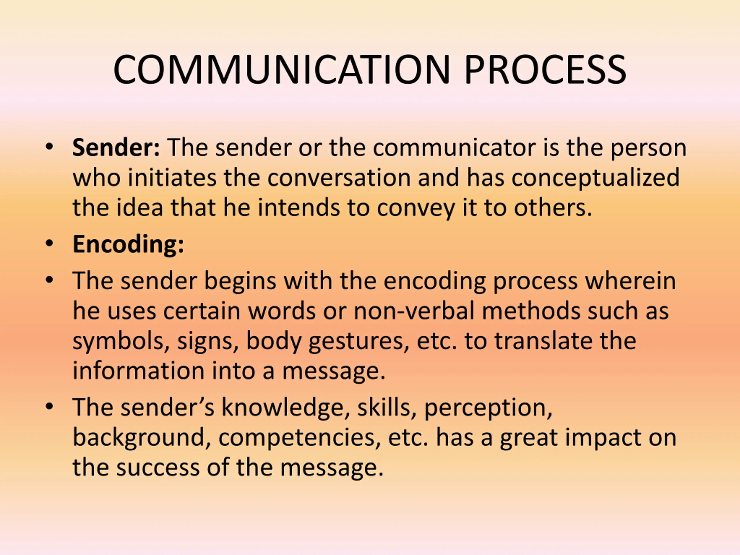 COMMUNICATION PROCESS Sender: The sender or the communicator is the person who initiates the conversation and has conceptualized the idea that he intends to convey it to others. Encoding: The sender begins with the encoding process wherein he uses certain words or non-verbal methods such as symbols, signs, body gestures, etc. to translate the information into a message. The sender s knowledge, skills, perception, background, competencies, etc. has a great impact on the success of the message.