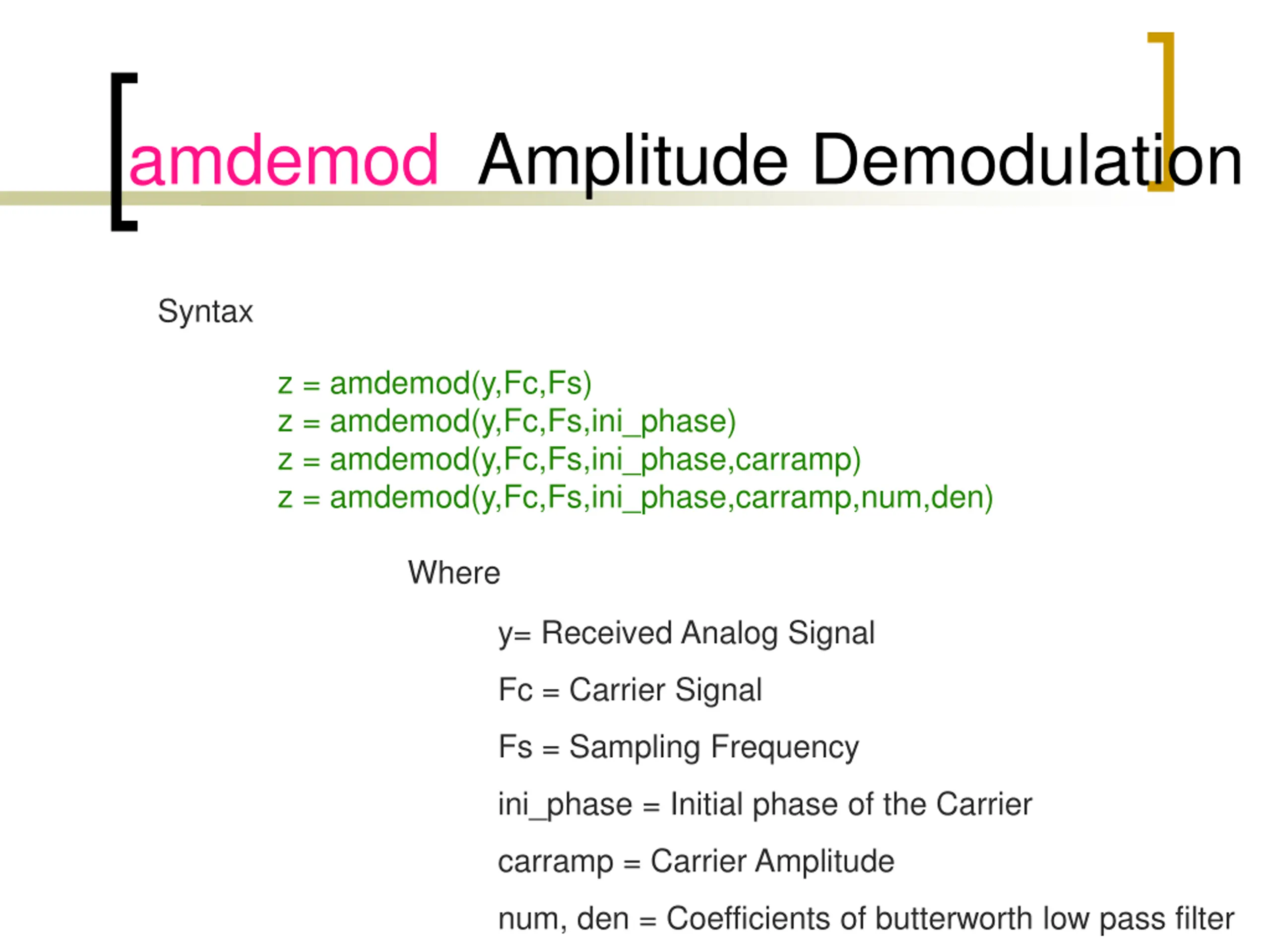 amdemod Amplitude Demodulation Syntax z = amdemod(y,Fc,Fs) z = amdemod(y,Fc,Fs,ini_phase) z = amdemod(y,Fc,Fs,ini_phase,carramp) z = amdemod(y,Fc,Fs,ini_phase,carramp,num,den) Where y= Received Analog Signal Fc = Carrier Signal Fs = Sampling Frequency ini_phase = Initial phase of the Carrier carramp = Carrier Amplitude num, den = Coefficients of butterworth low pass filter