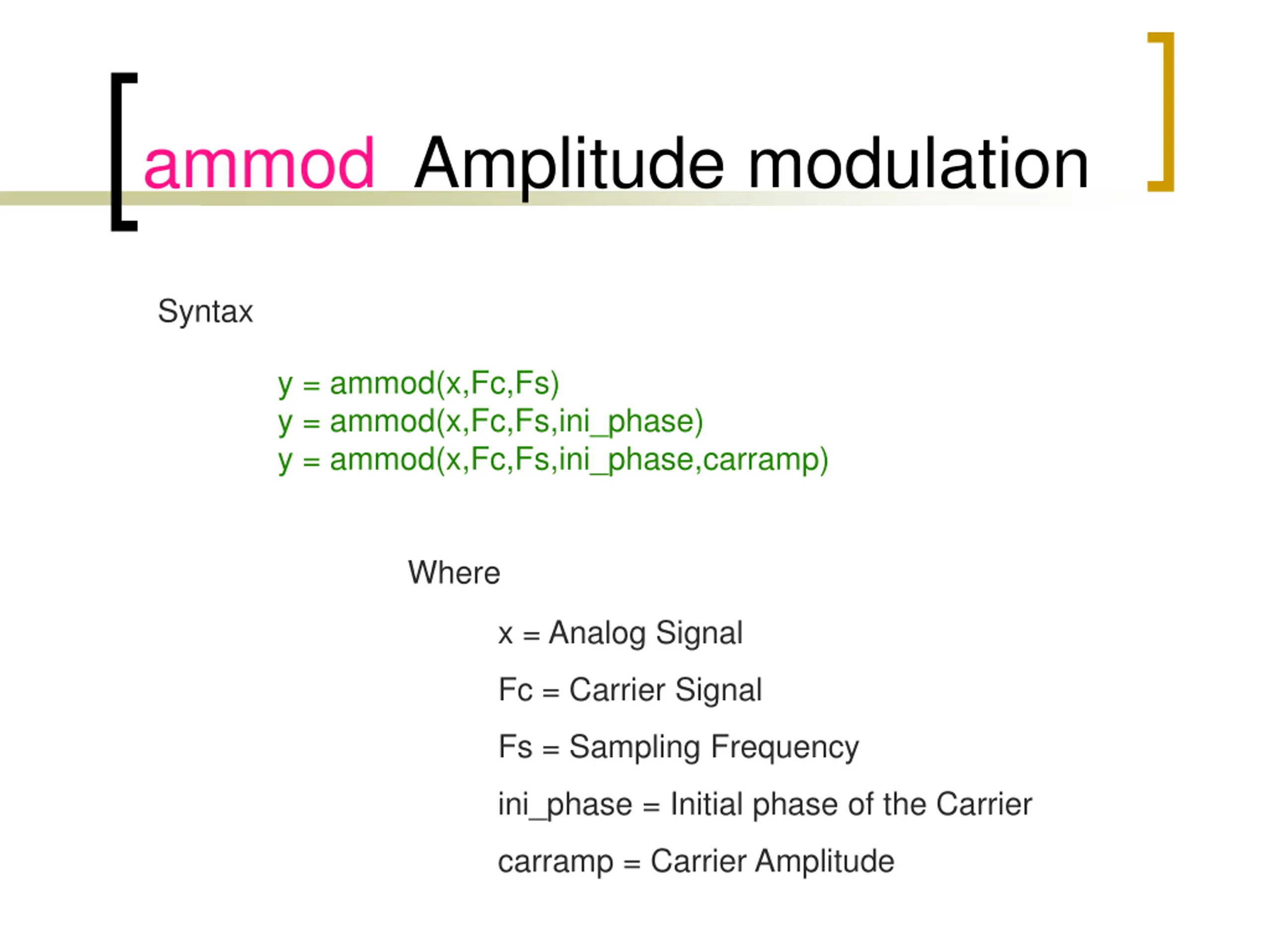 ammod Amplitude modulation Syntax y = ammod(x,Fc,Fs) y = ammod(x,Fc,Fs,ini_phase) y = ammod(x,Fc,Fs,ini_phase,carramp) Where x = Analog Signal Fc = Carrier Signal Fs = Sampling Frequency ini_phase = Initial phase of the Carrier carramp = Carrier Amplitude