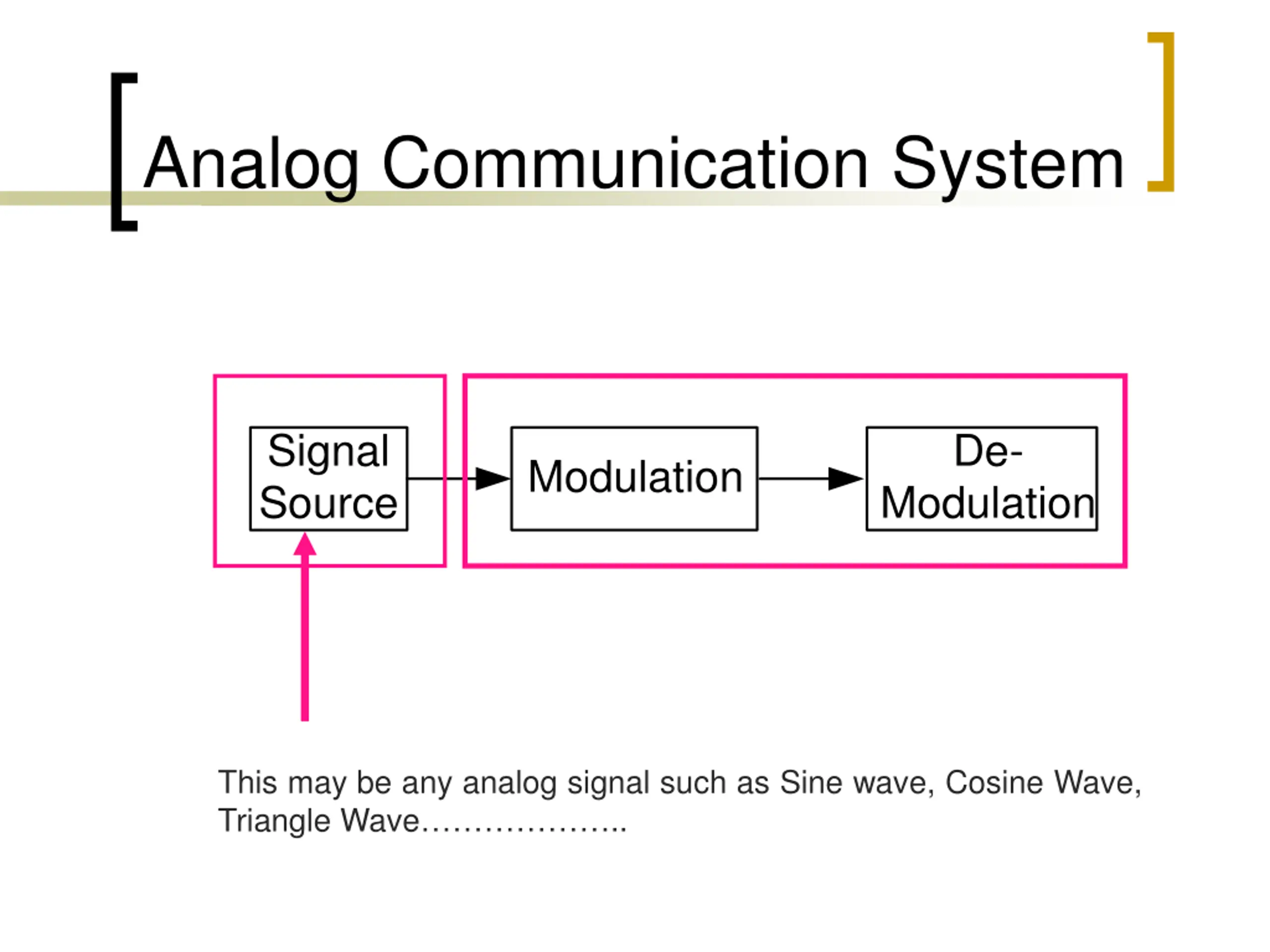 Analog Communication System Signal Source De- Modulation Modulation This may be any analog signal such as Sine wave, Cosine Wave, Triangle Wave ..