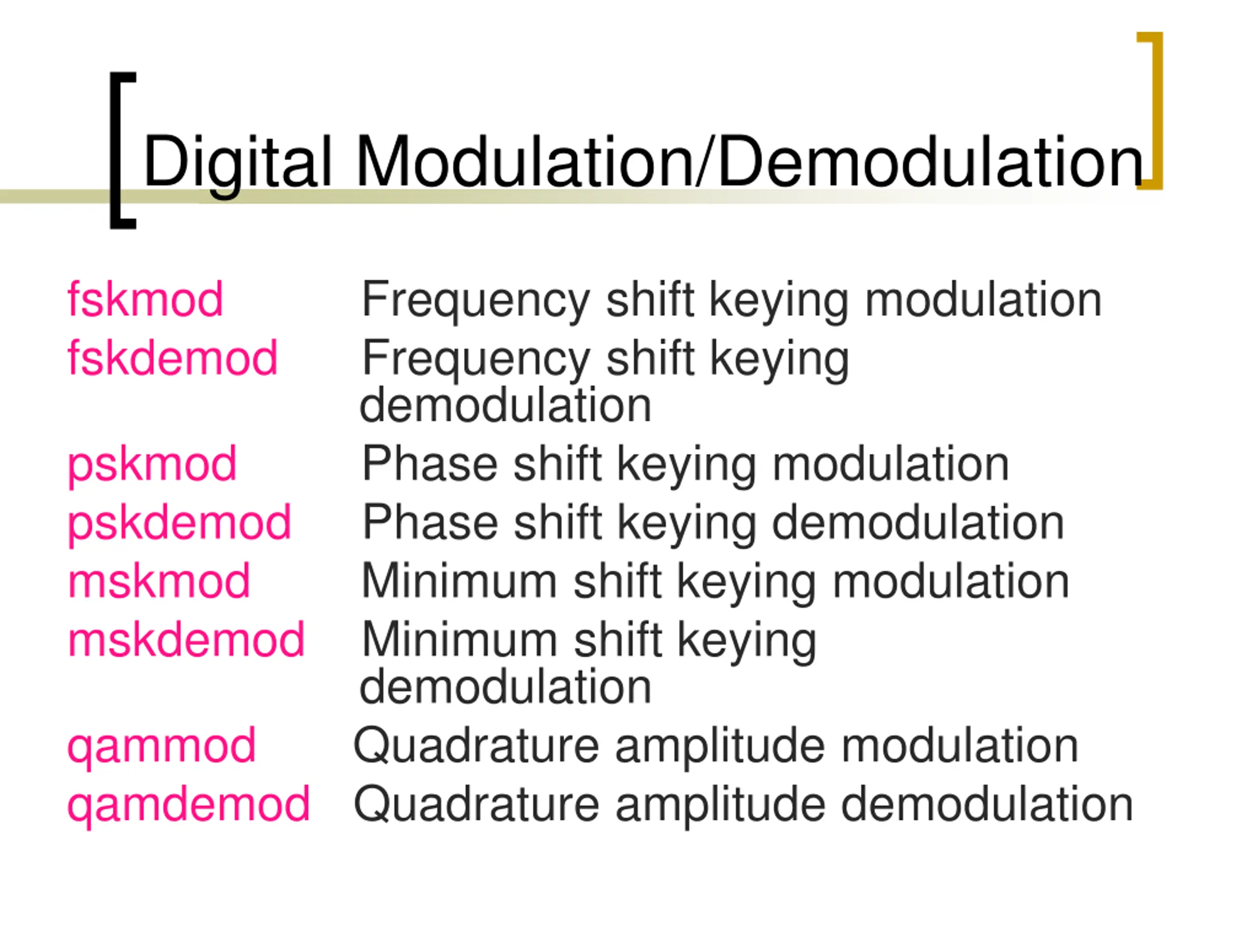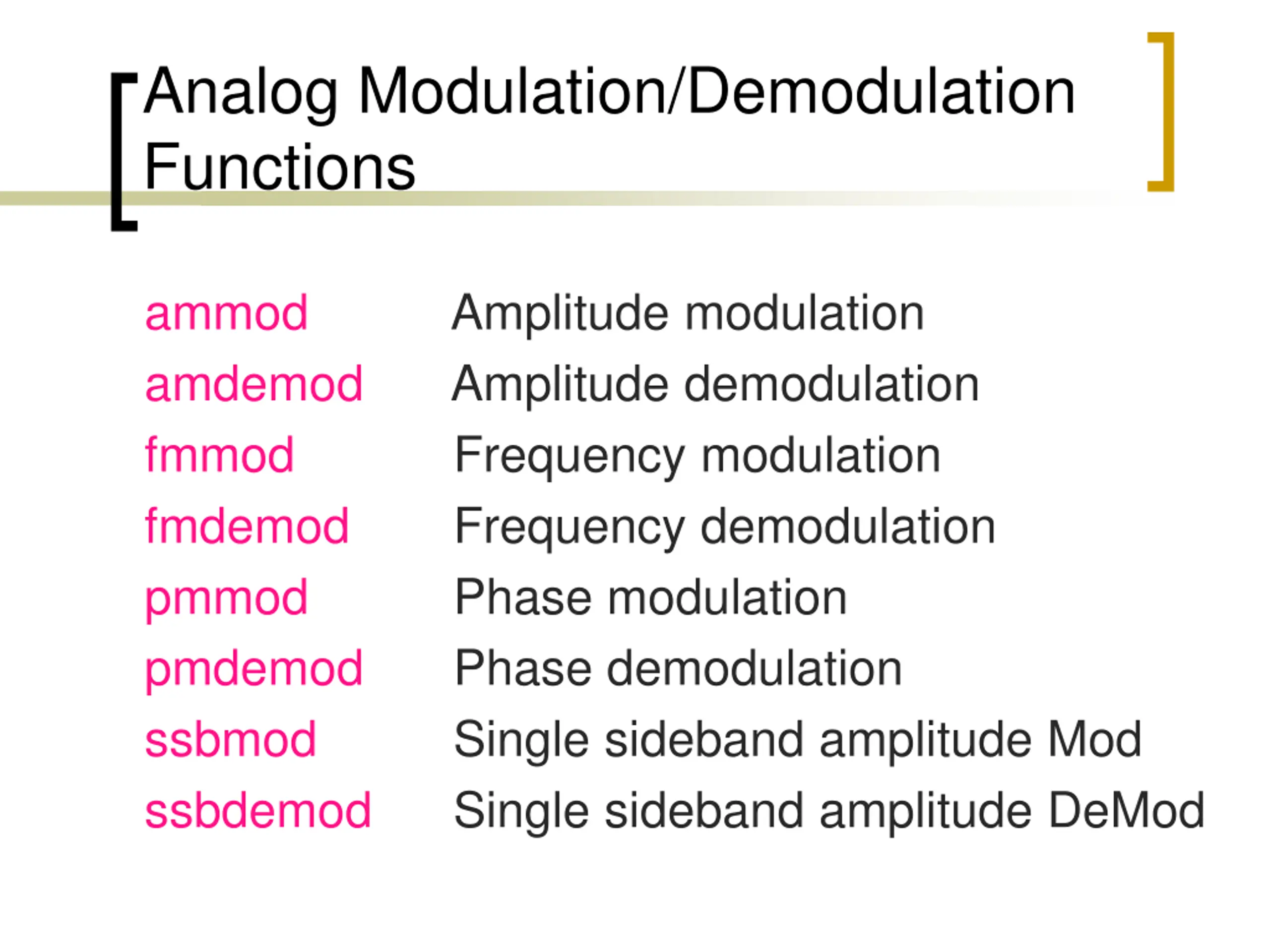 Analog Modulation/Demodulation Functions ammod amdemod Amplitude demodulation fmmod Frequency modulation fmdemod Frequency demodulation pmmod Phase modulation pmdemod Phase demodulation ssbmod Single sideband amplitude Mod ssbdemod Single sideband amplitude DeMod Amplitude modulation