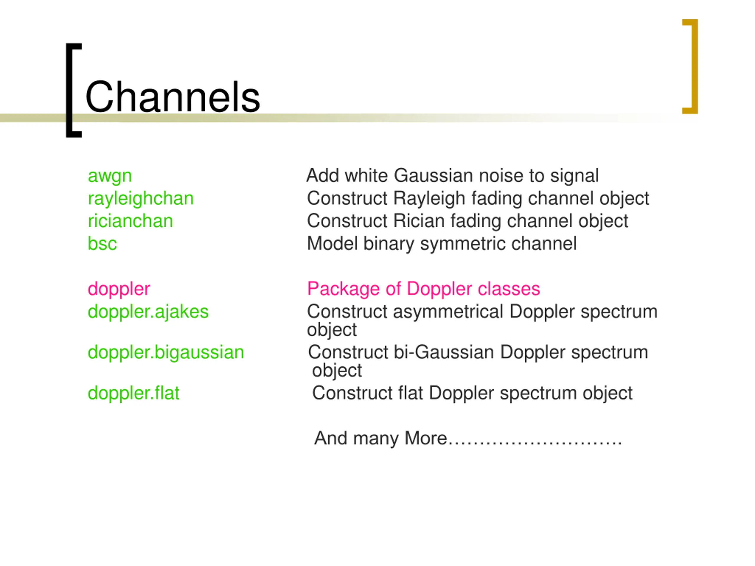 Channels awgn rayleighchan ricianchan bsc Add white Gaussian noise to signal Construct Rayleigh fading channel object Construct Rician fading channel object Model binary symmetric channel doppler doppler.ajakes doppler.bigaussian Construct bi-Gaussian Doppler spectrum object doppler.flat Construct flat Doppler spectrum object And many More . Package of Doppler classes Construct asymmetrical Doppler spectrum object