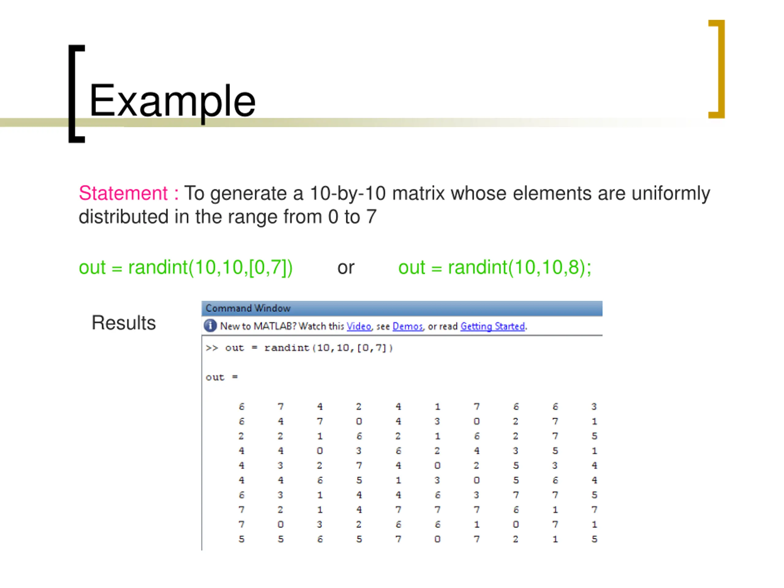 Example Statement : To generate a 10-by-10 matrix whose elements are uniformly distributed in the range from 0 to 7 out = randint(10,10,[0,7]) or out = randint(10,10,8); Results
