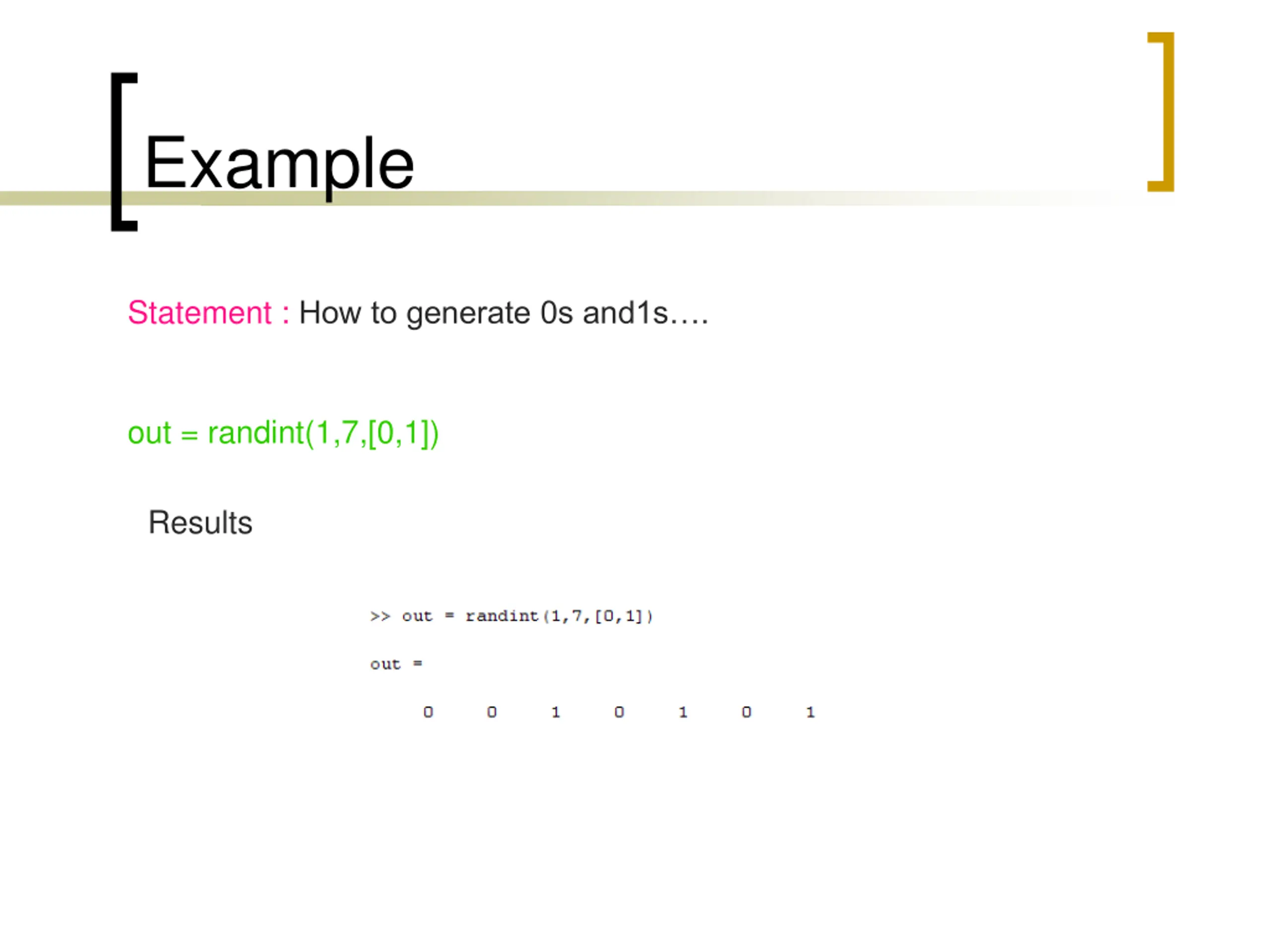 Example Statement : How to generate 0s and1s . out = randint(1,7,[0,1]) Results