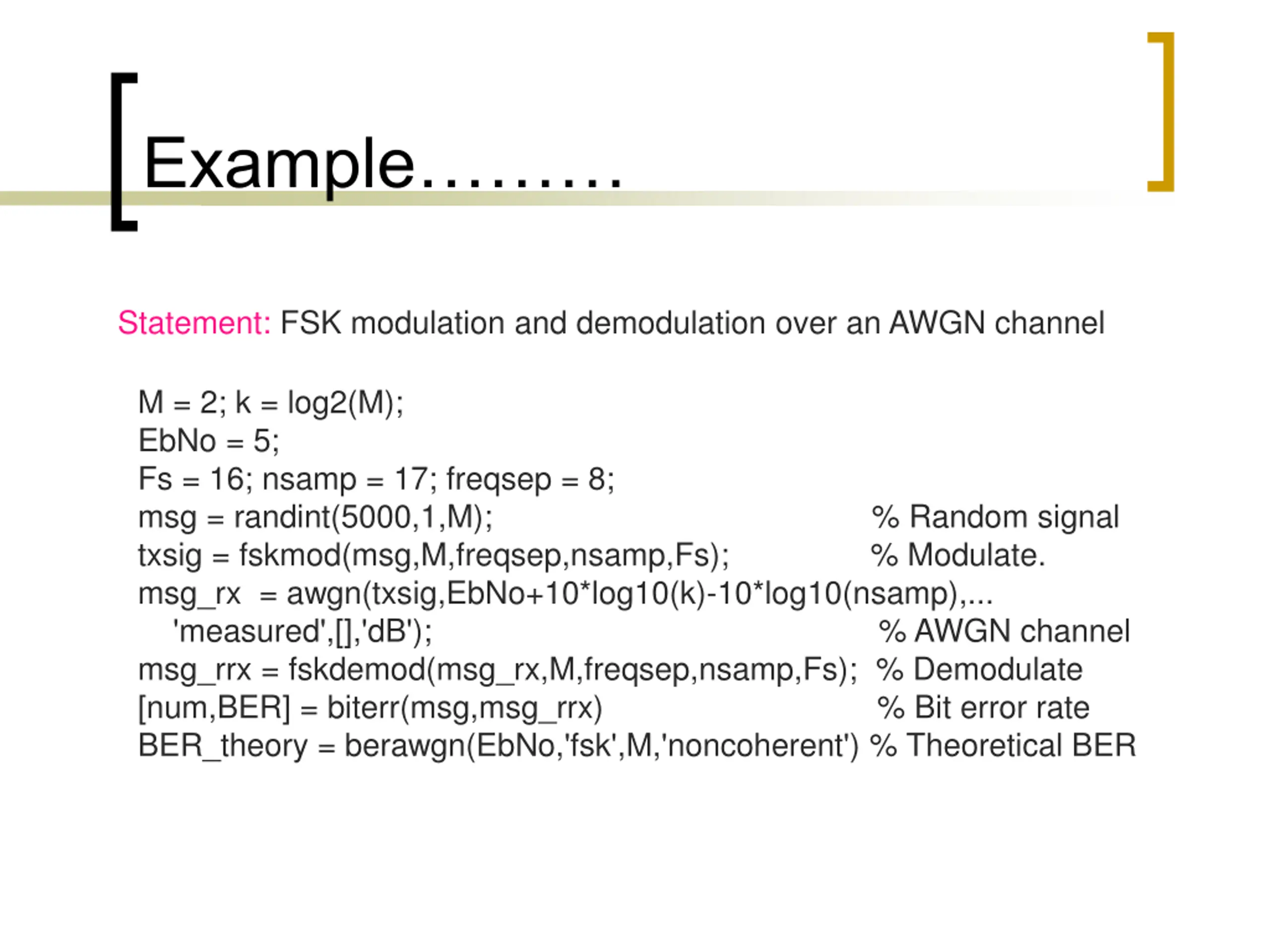 Example Statement: FSK modulation and demodulation over an AWGN channel M = 2; k = log2(M); EbNo = 5; Fs = 16; nsamp = 17; freqsep = 8; msg = randint(5000,1,M); % Random signal txsig = fskmod(msg,M,freqsep,nsamp,Fs); % Modulate. msg_rx = awgn(txsig,EbNo+10*log10(k)-10*log10(nsamp),... 'measured',[],'dB'); msg_rrx = fskdemod(msg_rx,M,freqsep,nsamp,Fs); % Demodulate [num,BER] = biterr(msg,msg_rrx) % Bit error rate BER_theory = berawgn(EbNo,'fsk',M,'noncoherent') % Theoretical BER % AWGN channel