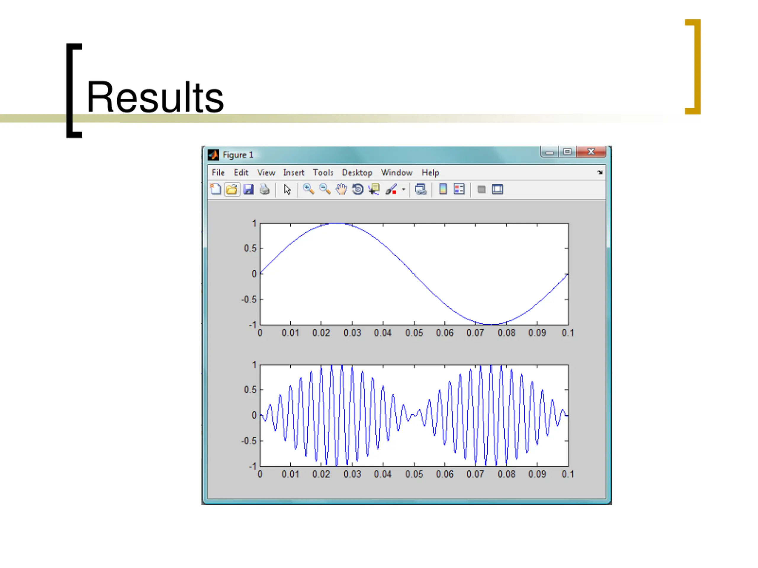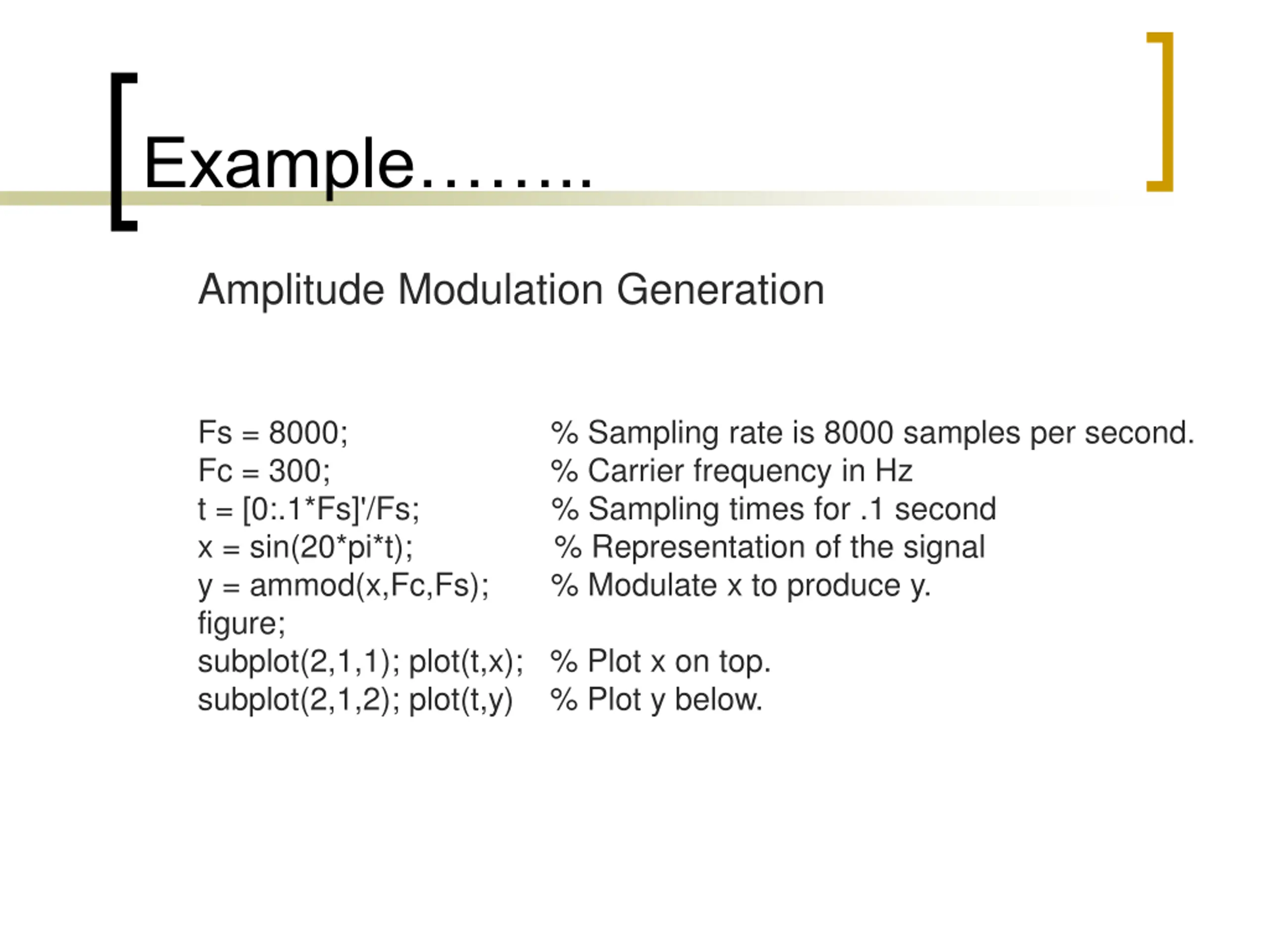 Example.. Amplitude Modulation Generation Fs = 8000; % Sampling rate is 8000 samples per second. Fc = 300; % Carrier frequency in Hz t = [0:.1*Fs]'/Fs; % Sampling times for .1 second x = sin(20*pi*t); % Representation of the signal y = ammod(x,Fc,Fs); % Modulate x to produce y. figure; subplot(2,1,1); plot(t,x); % Plot x on top. subplot(2,1,2); plot(t,y) % Plot y below.