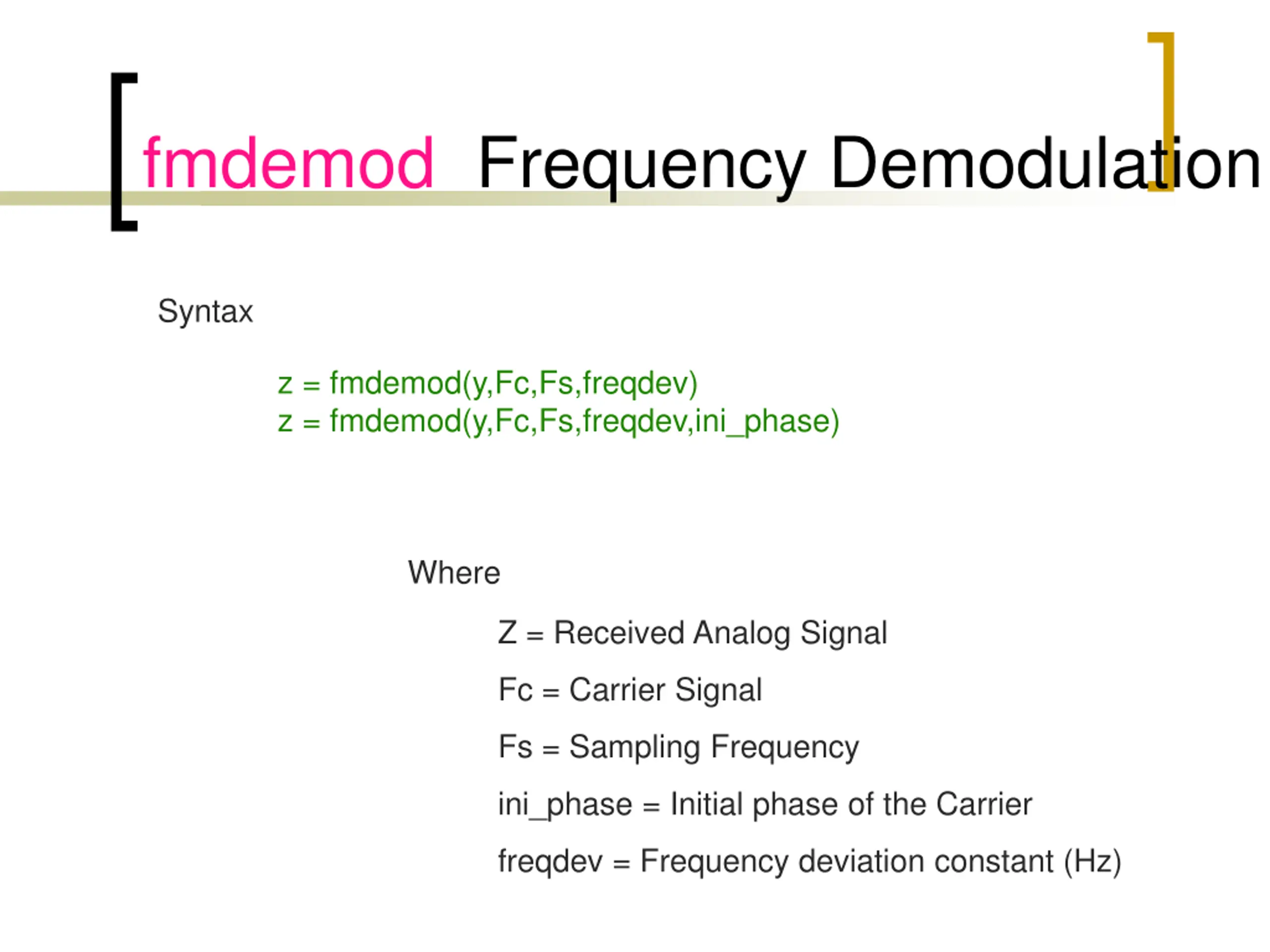 fmdemod Frequency Demodulation Syntax z = fmdemod(y,Fc,Fs,freqdev) z = fmdemod(y,Fc,Fs,freqdev,ini_phase) Where Z = Received Analog Signal Fc = Carrier Signal Fs = Sampling Frequency ini_phase = Initial phase of the Carrier freqdev = Frequency deviation constant (Hz)