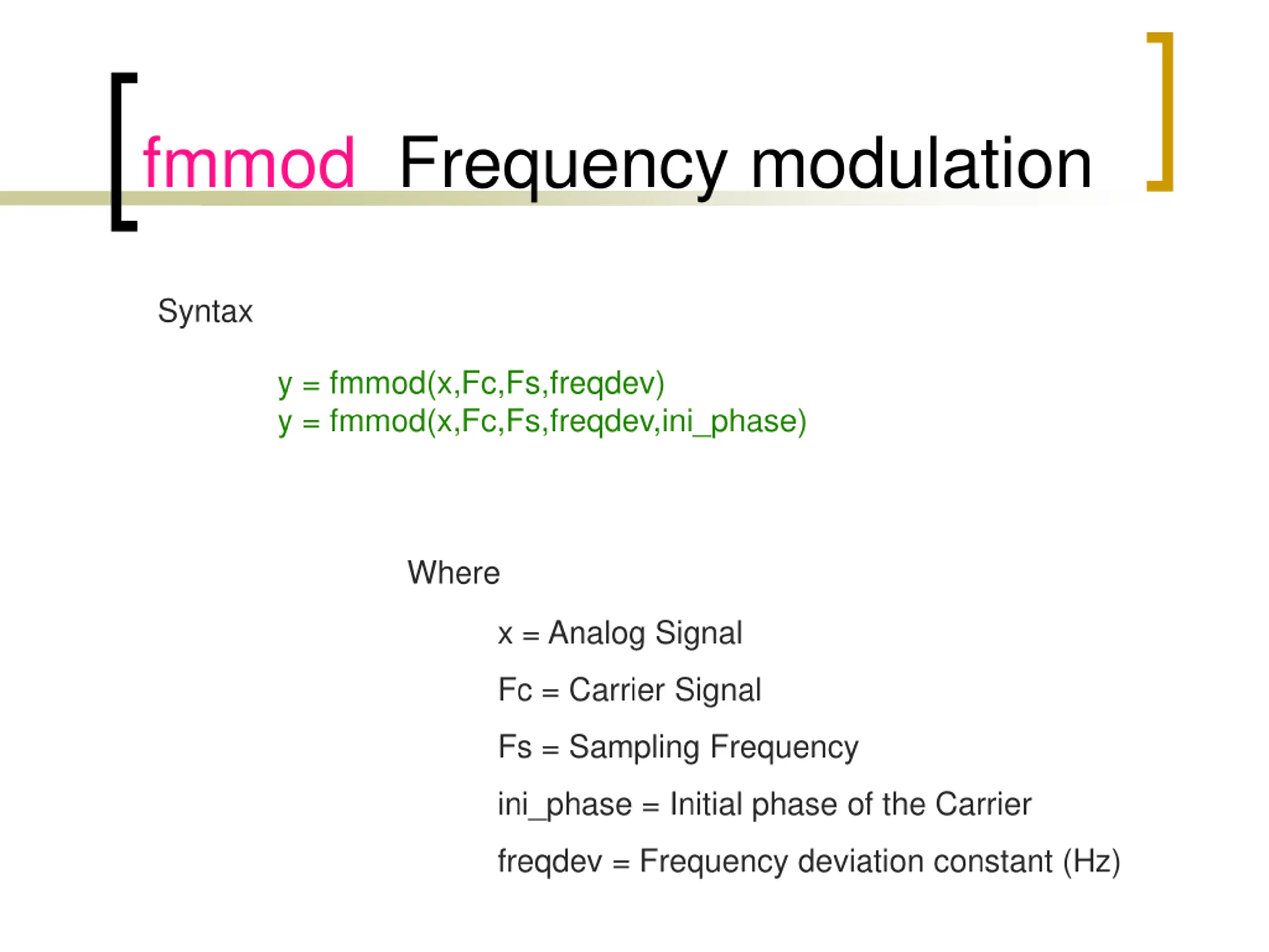 fmmod Frequency modulation Syntax y = fmmod(x,Fc,Fs,freqdev) y = fmmod(x,Fc,Fs,freqdev,ini_phase) Where x = Analog Signal Fc = Carrier Signal Fs = Sampling Frequency ini_phase = Initial phase of the Carrier freqdev = Frequency deviation constant (Hz)