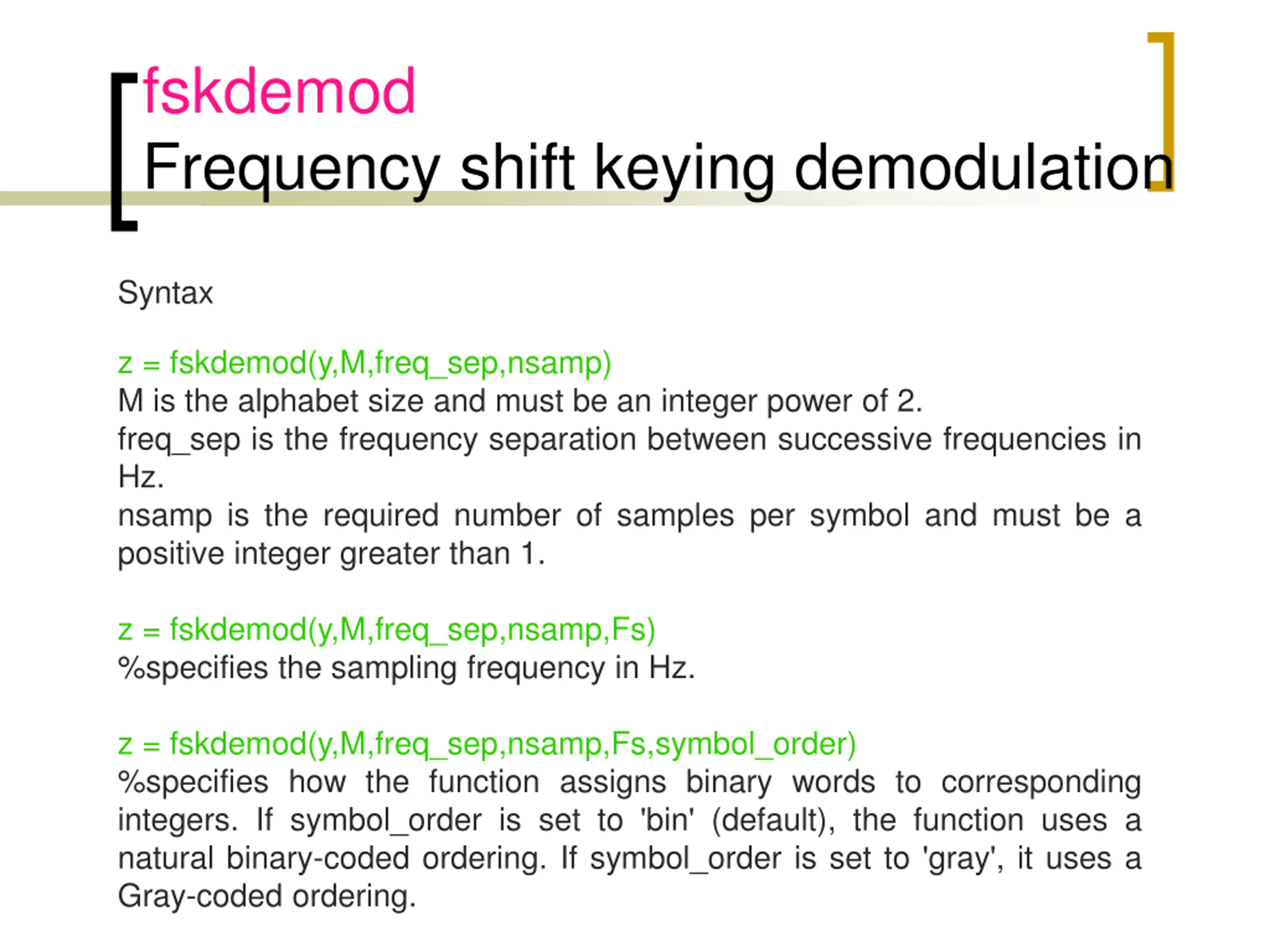 fskdemod Frequency shift keying demodulation Syntax z = fskdemod(y,M,freq_sep,nsamp) M is the alphabet size and must be an integer power of 2. freq_sep is the frequency separation between successive frequencies in Hz. nsamp is the required number of samples per symbol and must be a positive integer greater than 1. z = fskdemod(y,M,freq_sep,nsamp,Fs) %specifies the sampling frequency in Hz. z = fskdemod(y,M,freq_sep,nsamp,Fs,symbol_order) %specifies how the function assigns binary words to corresponding integers. If symbol_order is set to 'bin' (default), the function uses a natural binary-coded ordering. If symbol_order is set to 'gray', it uses a Gray-coded ordering.