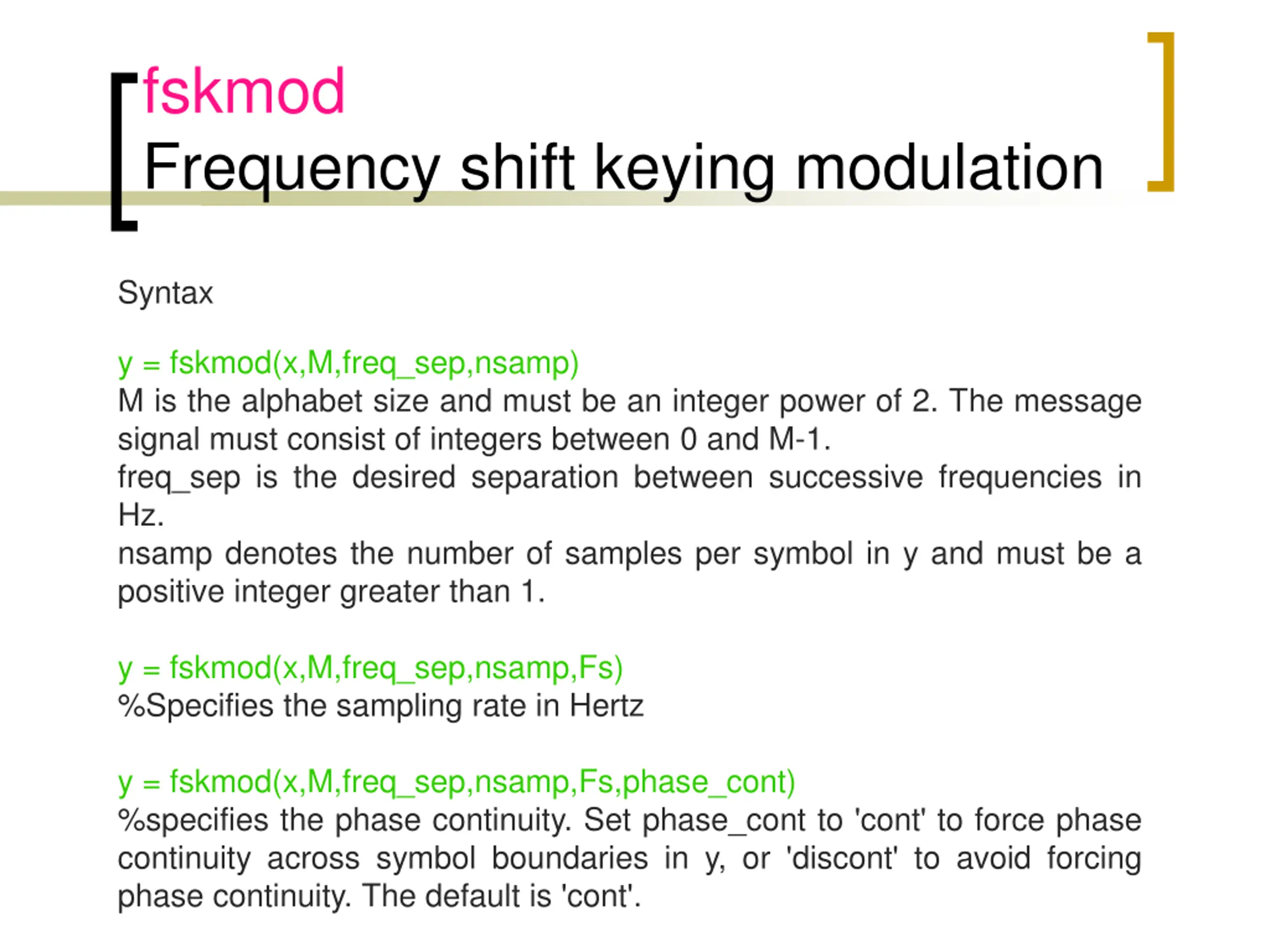fskmod Frequency shift keying modulation Syntax y = fskmod(x,M,freq_sep,nsamp) M is the alphabet size and must be an integer power of 2. The message signal must consist of integers between 0 and M-1. freq_sep is the desired separation between successive frequencies in Hz. nsamp denotes the number of samples per symbol in y and must be a positive integer greater than 1. y = fskmod(x,M,freq_sep,nsamp,Fs) %Specifies the sampling rate in Hertz y = fskmod(x,M,freq_sep,nsamp,Fs,phase_cont) %specifies the phase continuity. Set phase_cont to 'cont' to force phase continuity across symbol boundaries in y, or 'discont' to avoid forcing phase continuity. The default is 'cont'.
