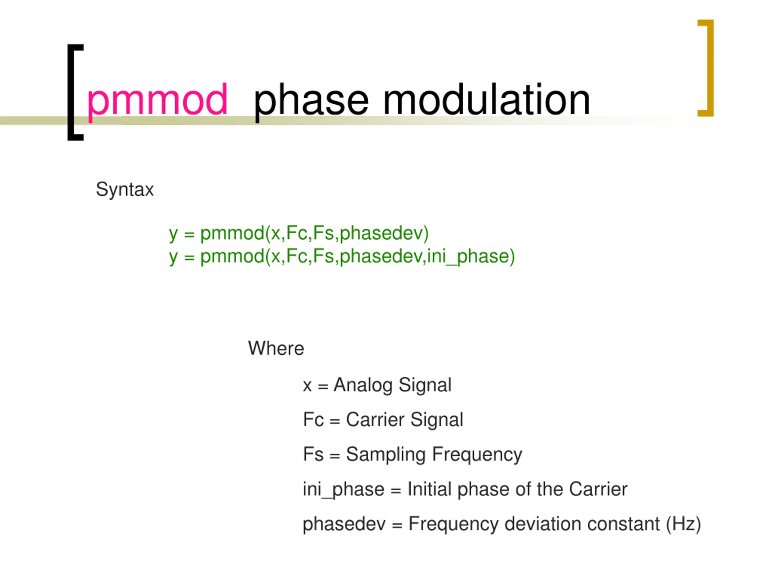 pmmod phase modulation Syntax y = pmmod(x,Fc,Fs,phasedev) y = pmmod(x,Fc,Fs,phasedev,ini_phase) Where x = Analog Signal Fc = Carrier Signal Fs = Sampling Frequency ini_phase = Initial phase of the Carrier phasedev = Frequency deviation constant (Hz)