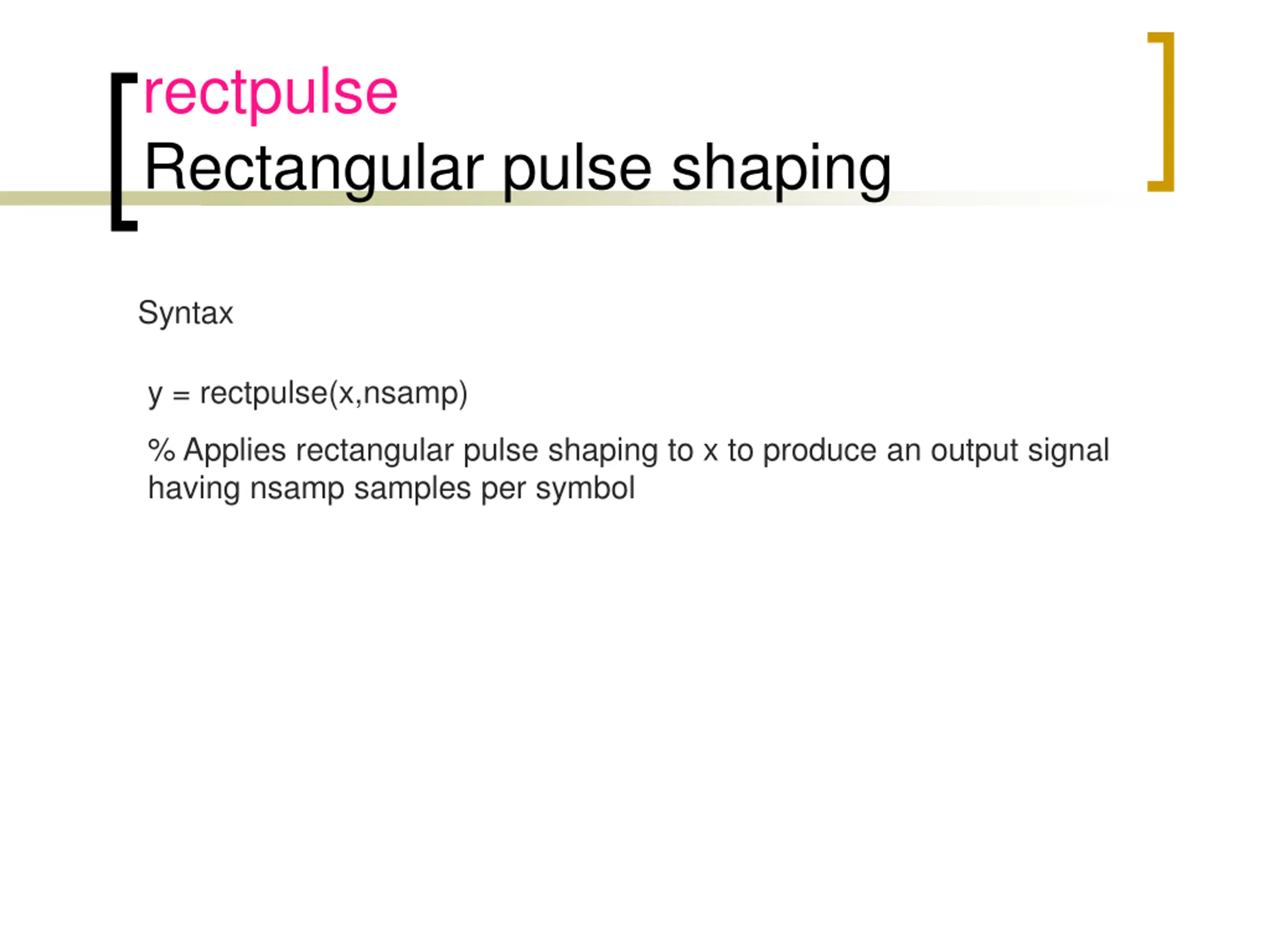 rectpulse Rectangular pulse shaping Syntax y = rectpulse(x,nsamp) % Applies rectangular pulse shaping to x to produce an output signal having nsamp samples per symbol