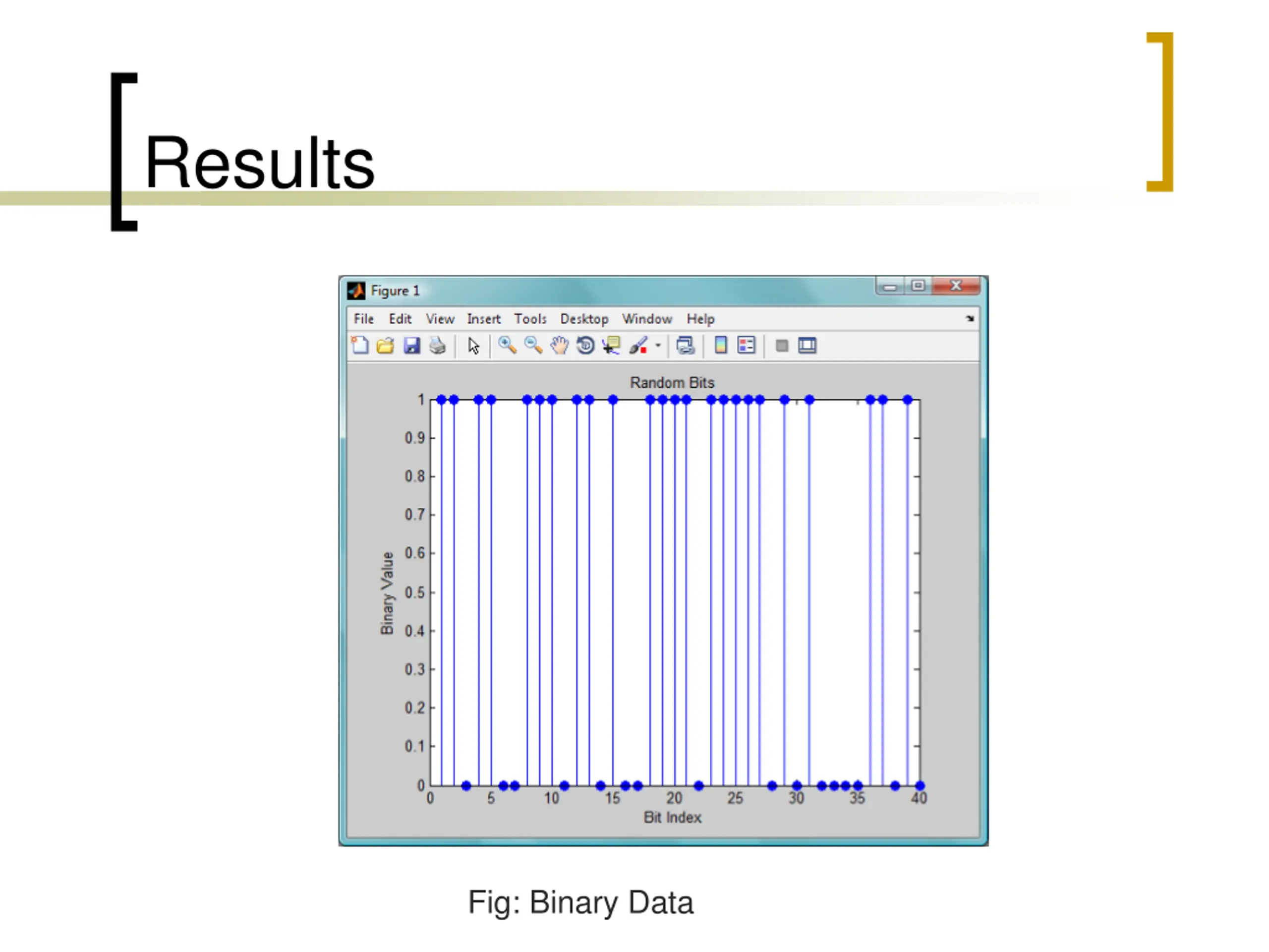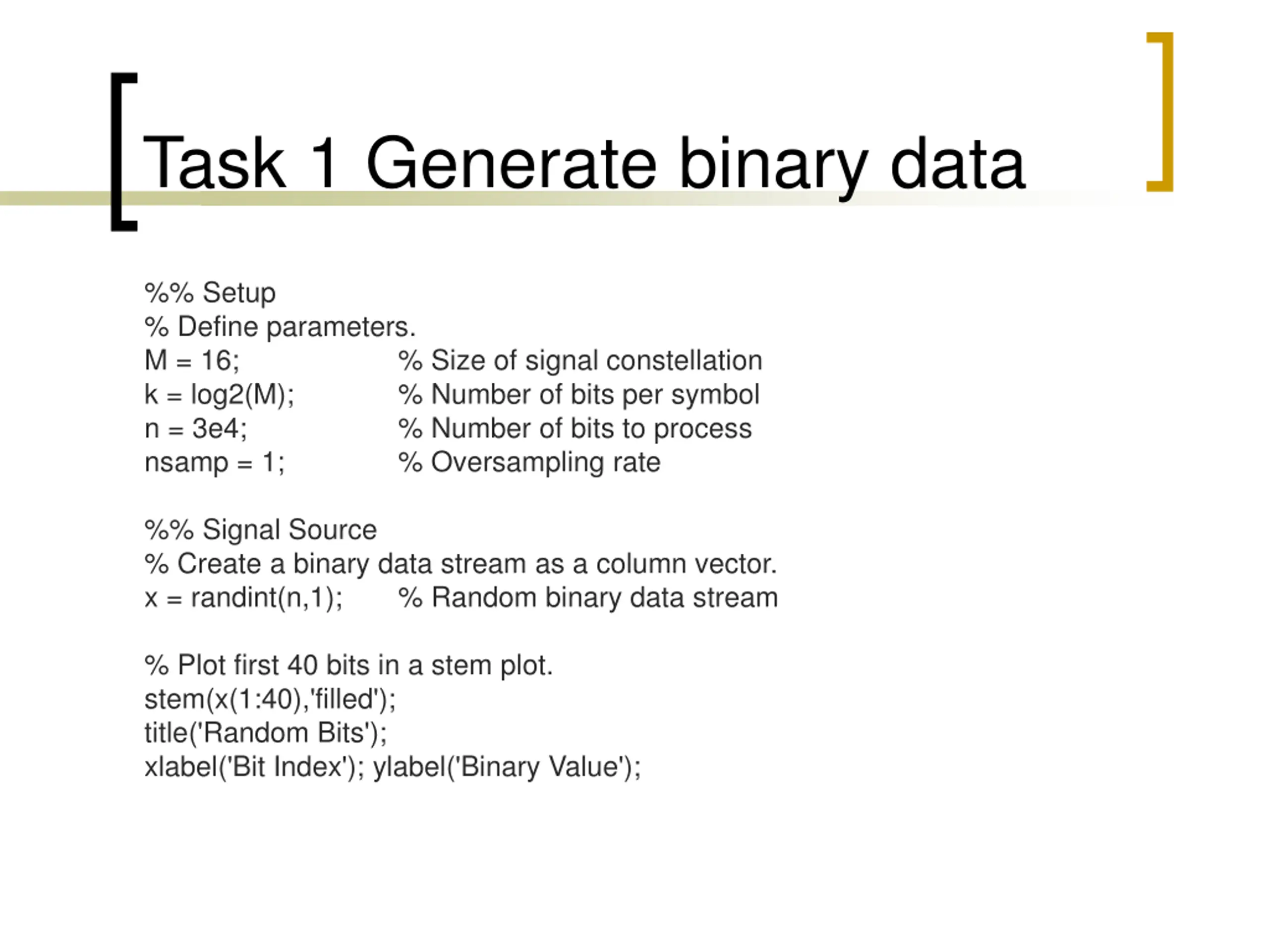 Task 1 Generate binary data %% Setup % Define parameters. M = 16; k = log2(M); n = 3e4; nsamp = 1; % Size of signal constellation % Number of bits per symbol % Number of bits to process % Oversampling rate %% Signal Source % Create a binary data stream as a column vector. x = randint(n,1); % Random binary data stream % Plot first 40 bits in a stem plot. stem(x(1:40),'filled'); title('Random Bits'); xlabel('Bit Index'); ylabel('Binary Value');