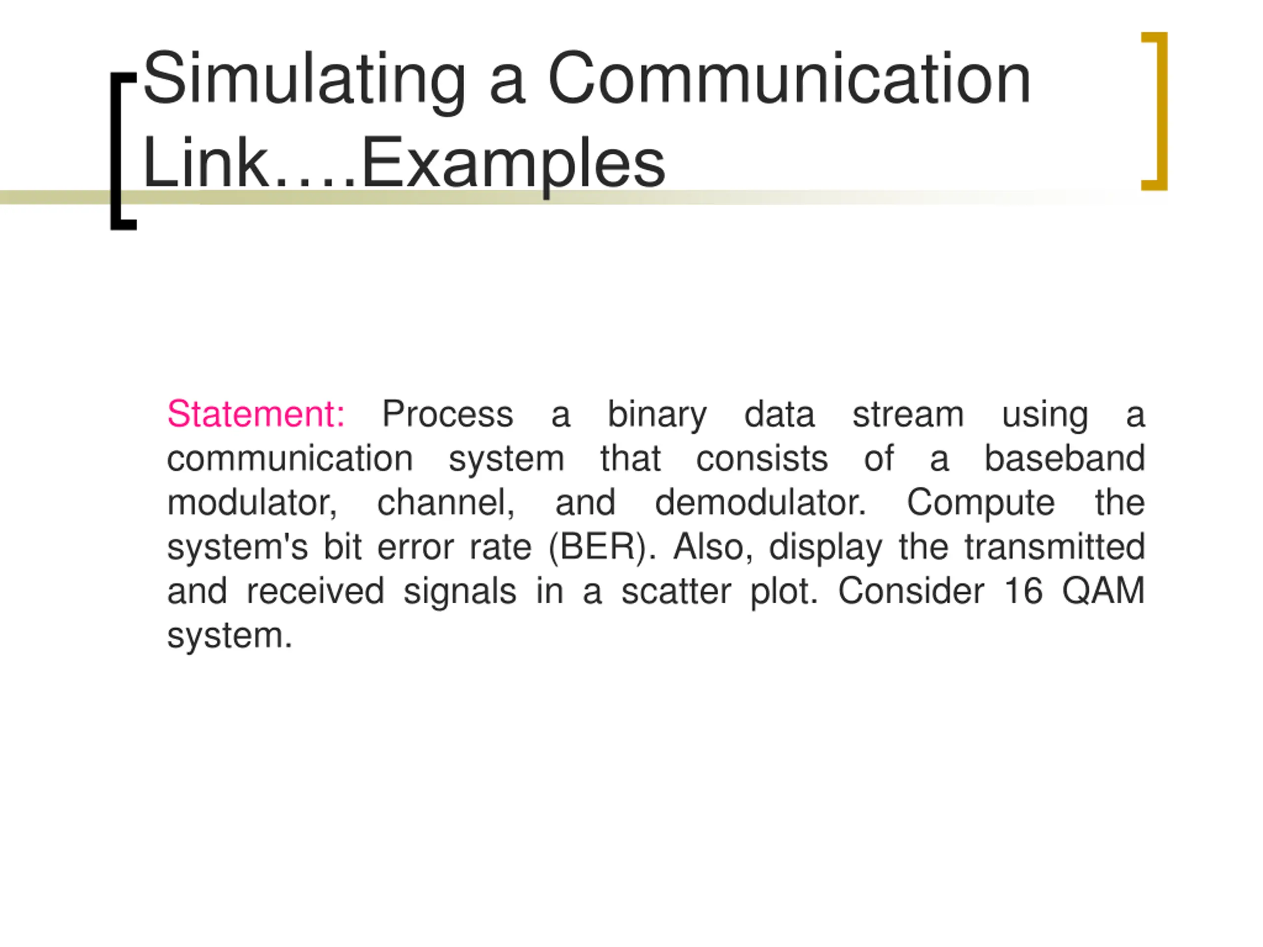Simulating a Communication Link .Examples Statement: Process a binary data stream using a communication system that consists of a baseband modulator, channel, and demodulator. Compute the system's bit error rate (BER). Also, display the transmitted and received signals in a scatter plot. Consider 16 QAM system.
