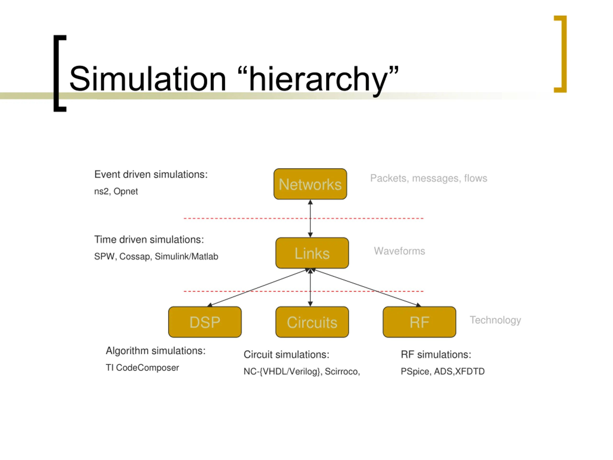 Simulation hierarchy Event driven simulations: Packets, messages, flows Networks ns2, Opnet Time driven simulations: Links Waveforms SPW, Cossap, Simulink/Matlab DSP Circuits RF Technology Algorithm simulations: Circuit simulations: RF simulations: TI CodeComposer NC-{VHDL/Verilog}, Scirroco, PSpice, ADS,XFDTD