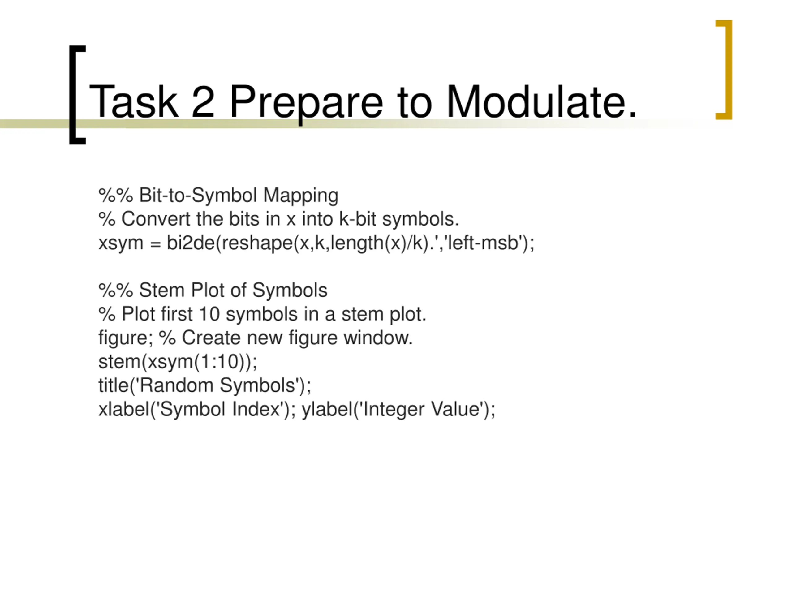 Task 2 Prepare to Modulate. %% Bit-to-Symbol Mapping % Convert the bits in x into k-bit symbols. xsym = bi2de(reshape(x,k,length(x)/k).','left-msb'); %% Stem Plot of Symbols % Plot first 10 symbols in a stem plot. figure; % Create new figure window. stem(xsym(1:10)); title('Random Symbols'); xlabel('Symbol Index'); ylabel('Integer Value');