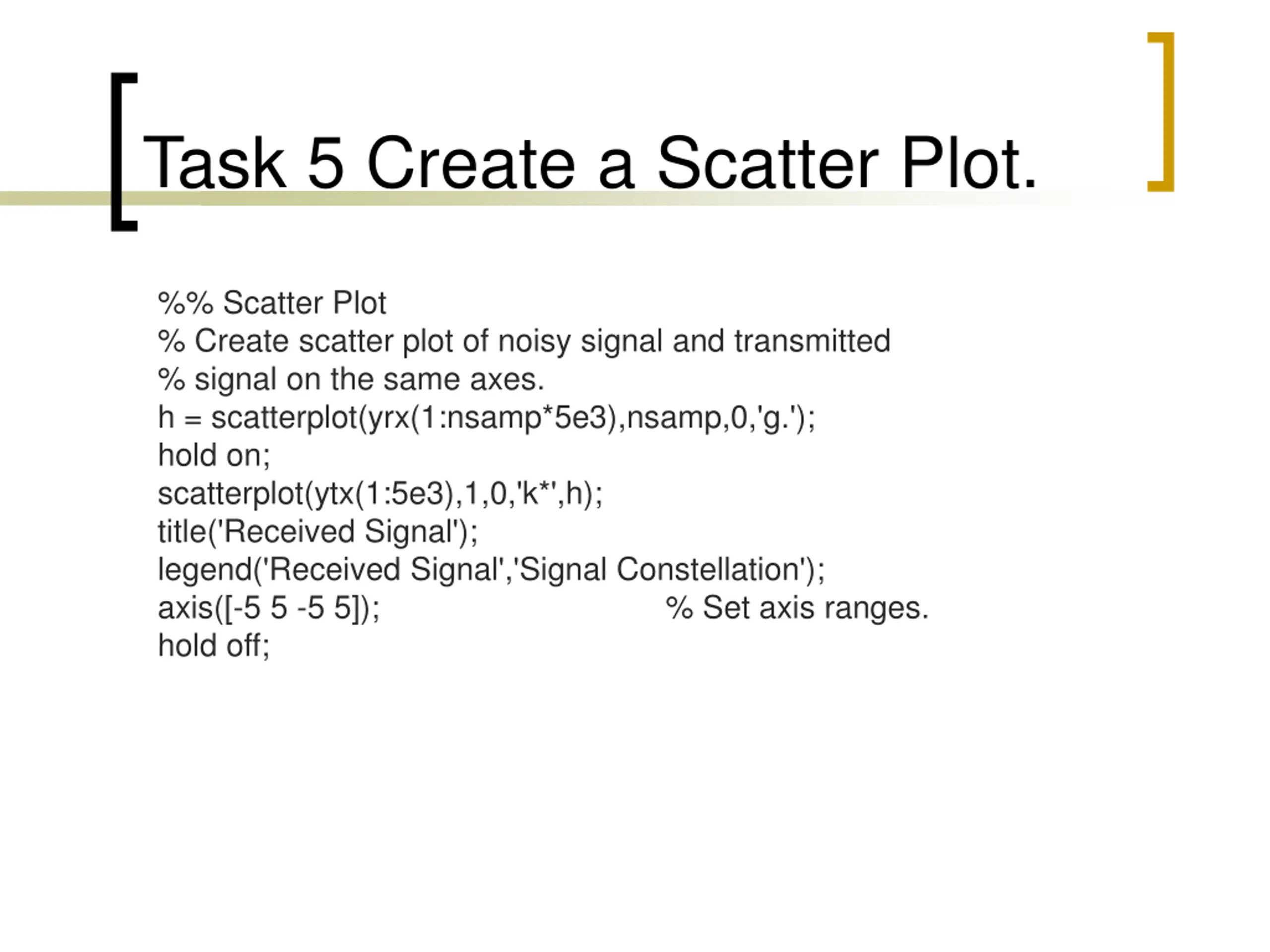 Task 5 Create a Scatter Plot. %% Scatter Plot % Create scatter plot of noisy signal and transmitted % signal on the same axes. h = scatterplot(yrx(1:nsamp*5e3),nsamp,0,'g.'); hold on; scatterplot(ytx(1:5e3),1,0,'k*',h); title('Received Signal'); legend('Received Signal','Signal Constellation'); axis([-5 5 -5 5]); hold off; % Set axis ranges.