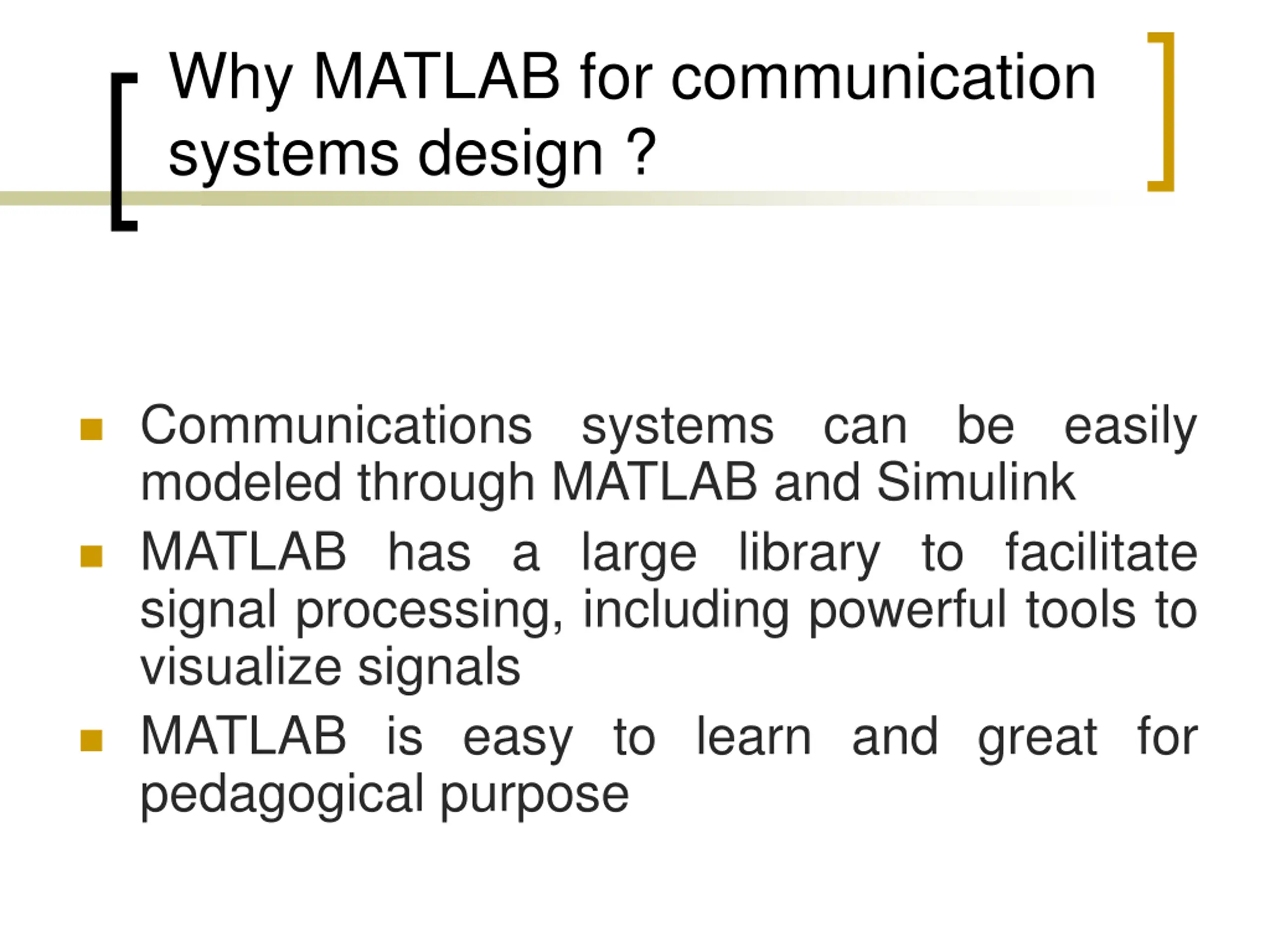 Why MATLAB for communication systems design ? Communications systems can be easily modeled through MATLAB and Simulink MATLAB has a large library to facilitate signal processing, including powerful tools to visualize signals MATLAB is easy to learn and great for pedagogical purpose
