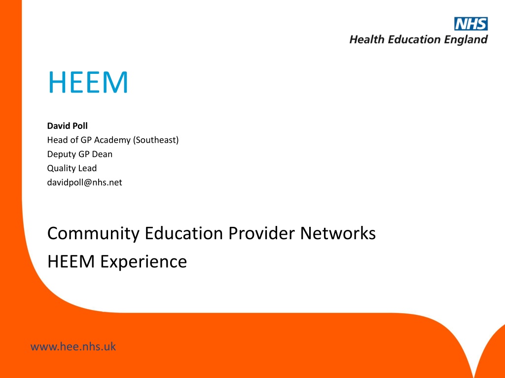 HEEM David Poll Head of GP Academy (Southeast) Deputy GP Dean Quality Lead davidpoll@nhs.net Community Education Provider Networks HEEM Experience www.hee.nhs.uk www.hee.nhs.uk