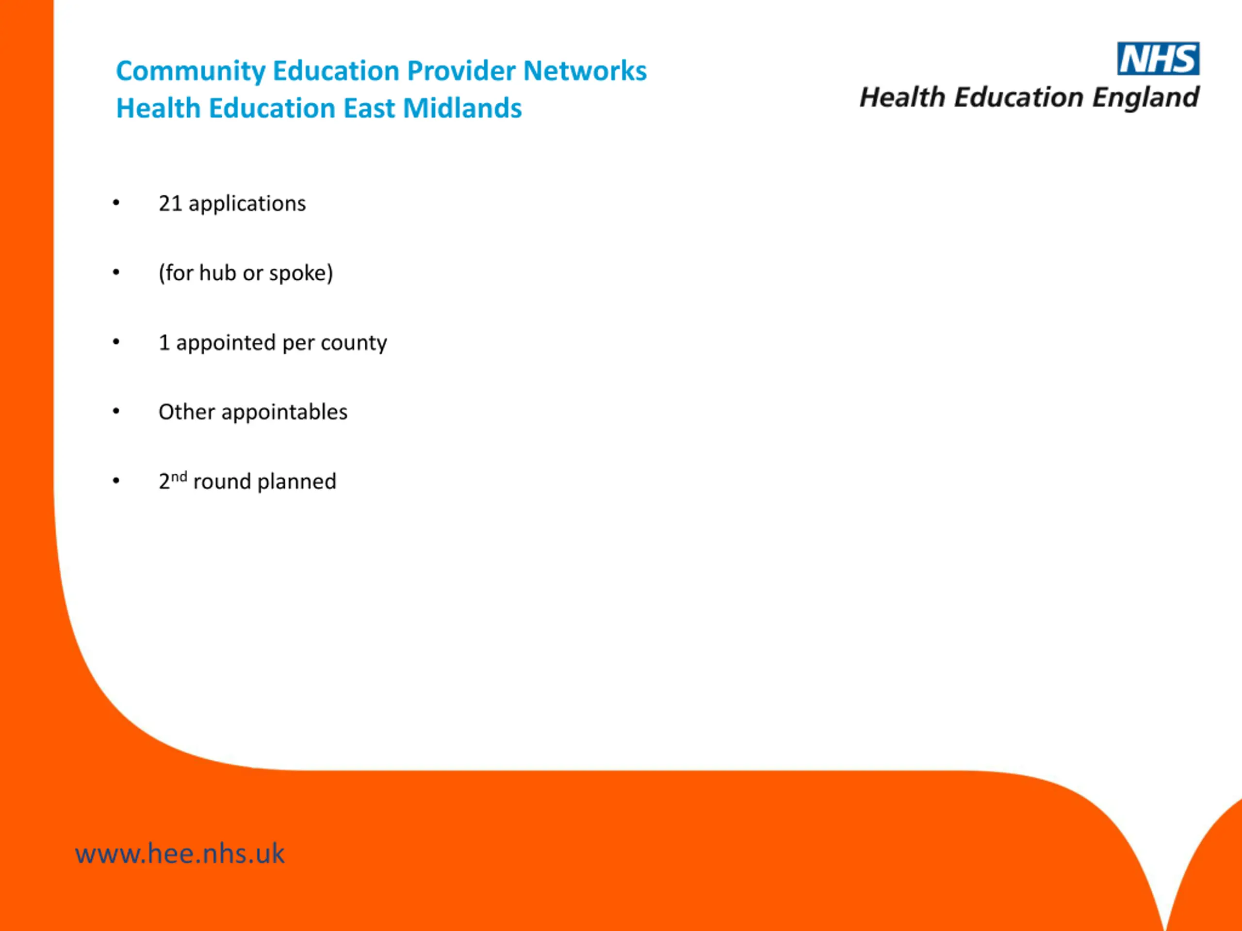 Community Education Provider Networks Health Education East Midlands 21 applications (for hub or spoke) 1 appointed per county Other appointables 2nd round planned www.hee.nhs.uk www.hee.nhs.uk