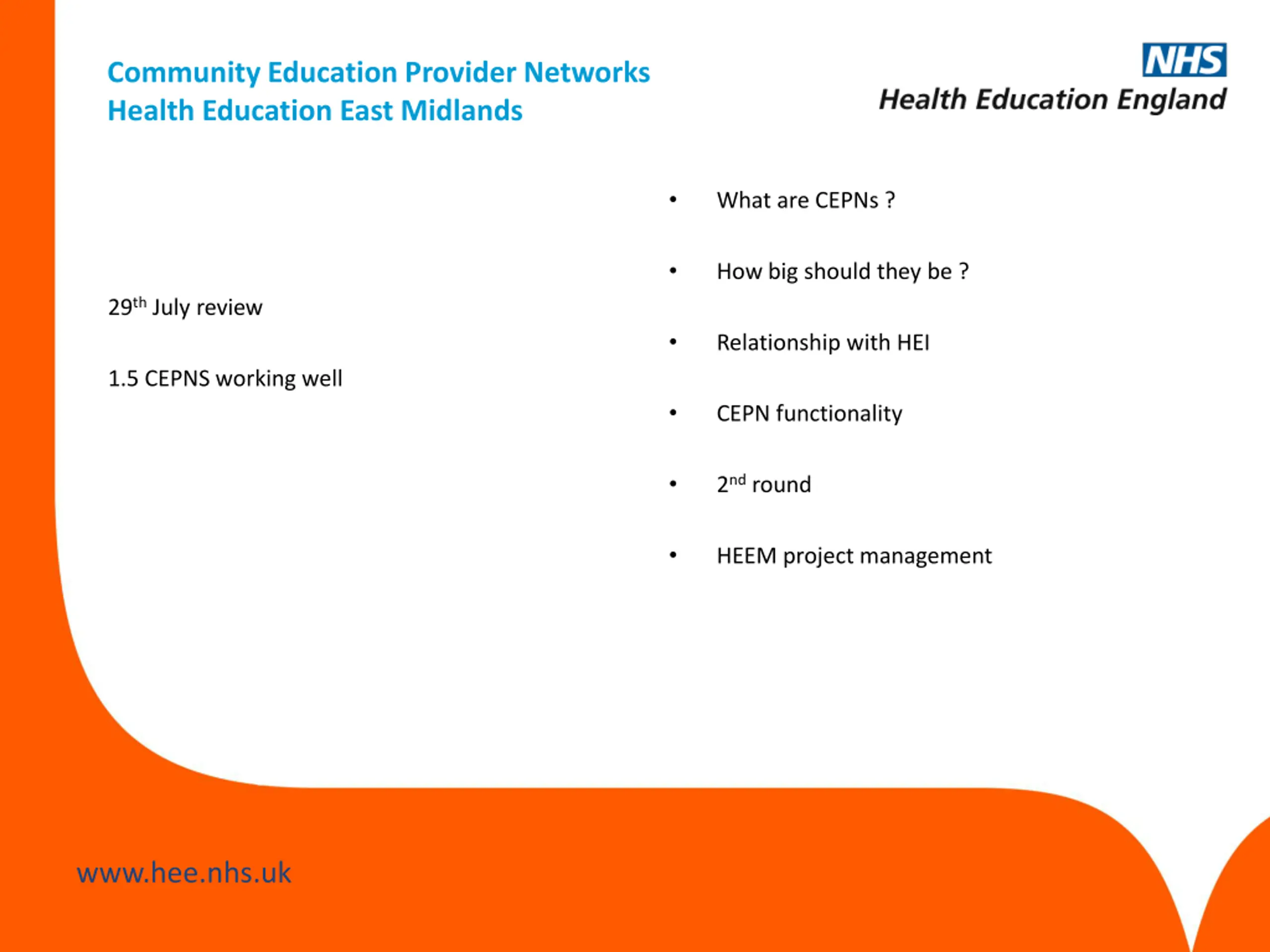 Community Education Provider Networks Health Education East Midlands Bidding process. Practices contacted Jan 2015. Assessment panel. Appointment/initial discussions April 2015 50K 29th July 2015 first review date. www.hee.nhs.uk www.hee.nhs.uk