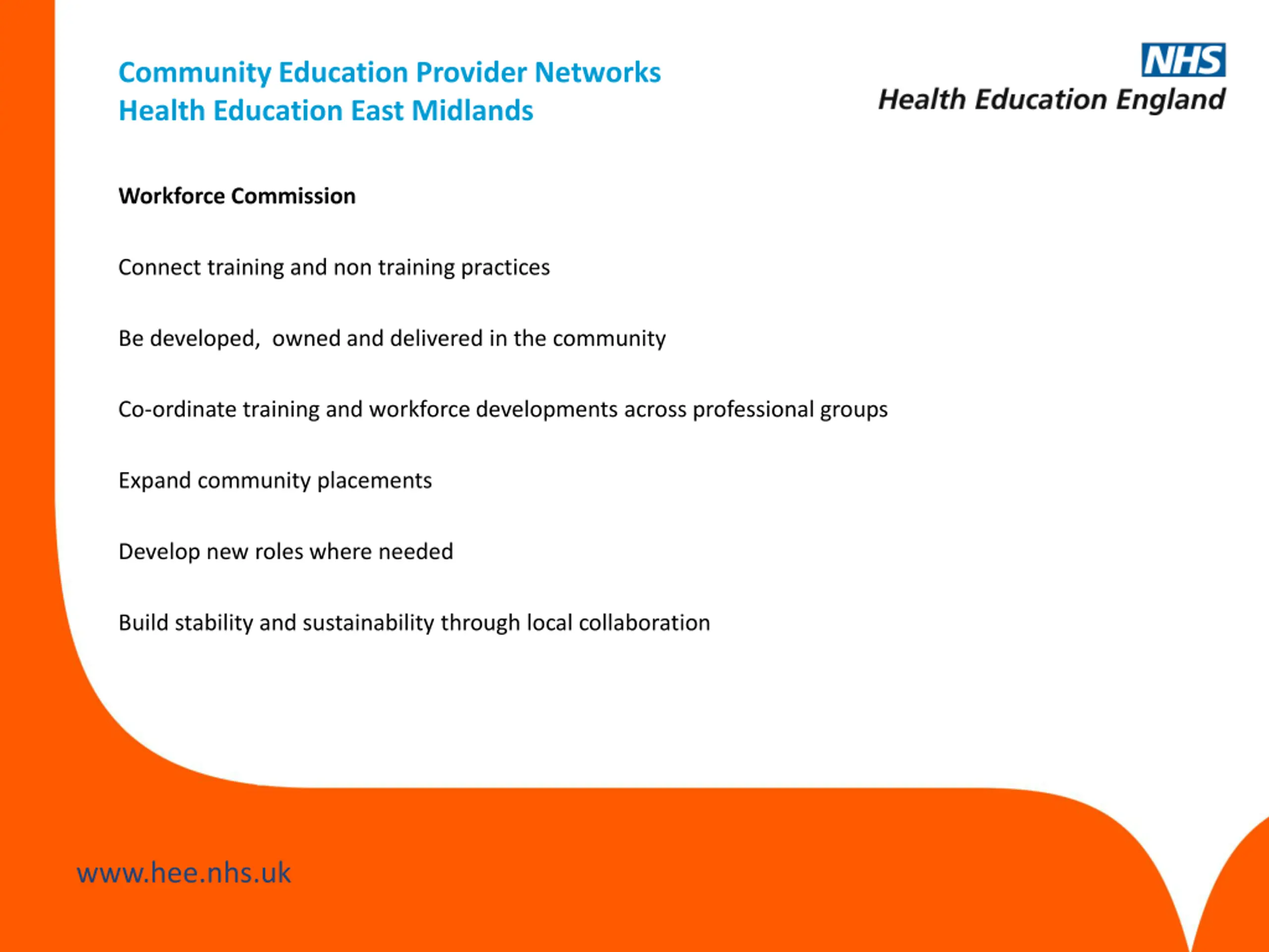 Community Education Provider Networks Health Education East Midlands Workforce Commission Connect training and non training practices Be developed, owned and delivered in the community Co-ordinate training and workforce developments across professional groups Expand community placements Develop new roles where needed Build stability and sustainability through local collaboration www.hee.nhs.uk www.hee.nhs.uk
