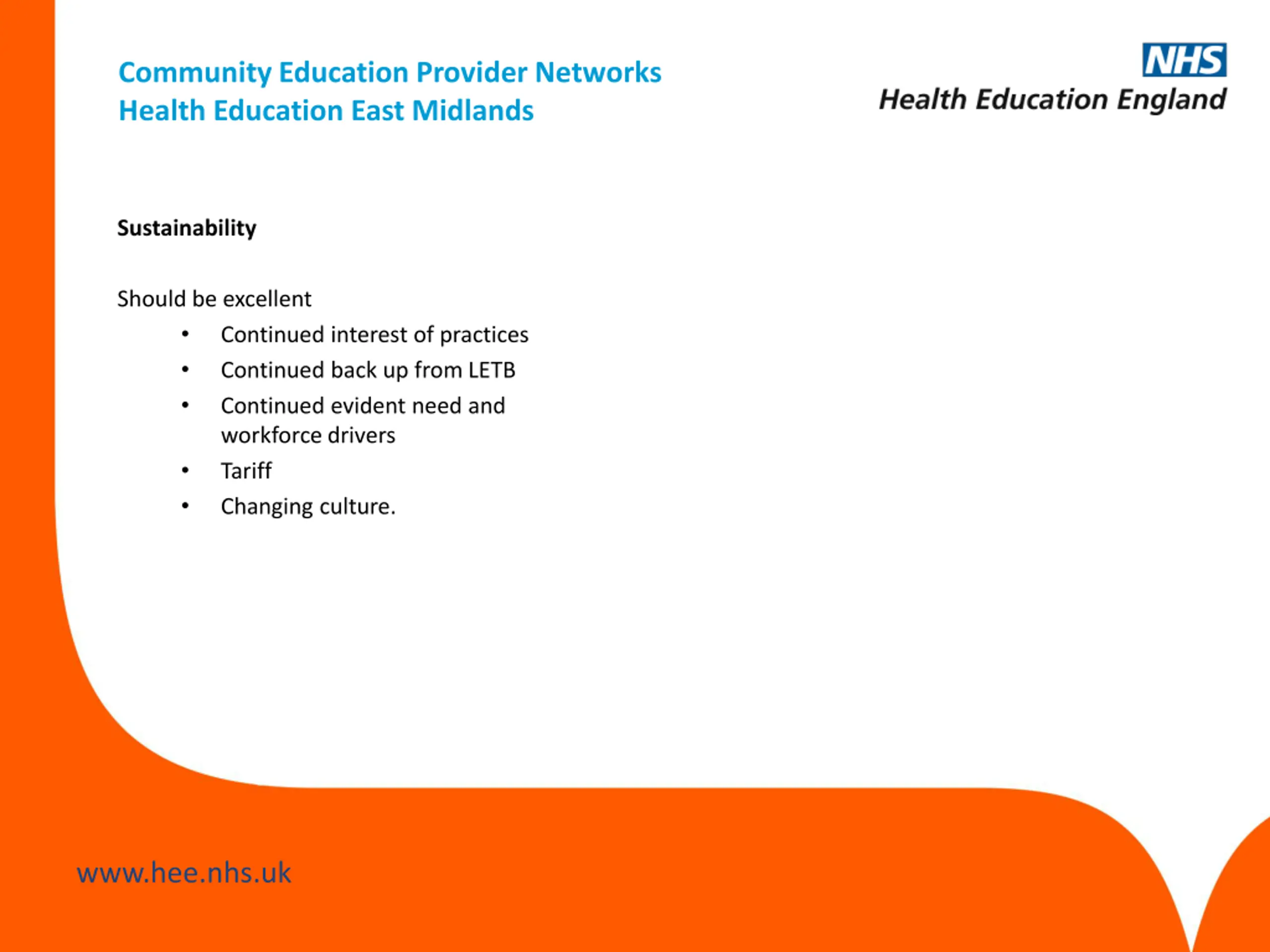 Community Education Provider Networks Health Education East Midlands Sustainability Should be excellent Continued interest of practices Continued back up from LETB Continued evident need and workforce drivers Tariff Changing culture. www.hee.nhs.uk www.hee.nhs.uk