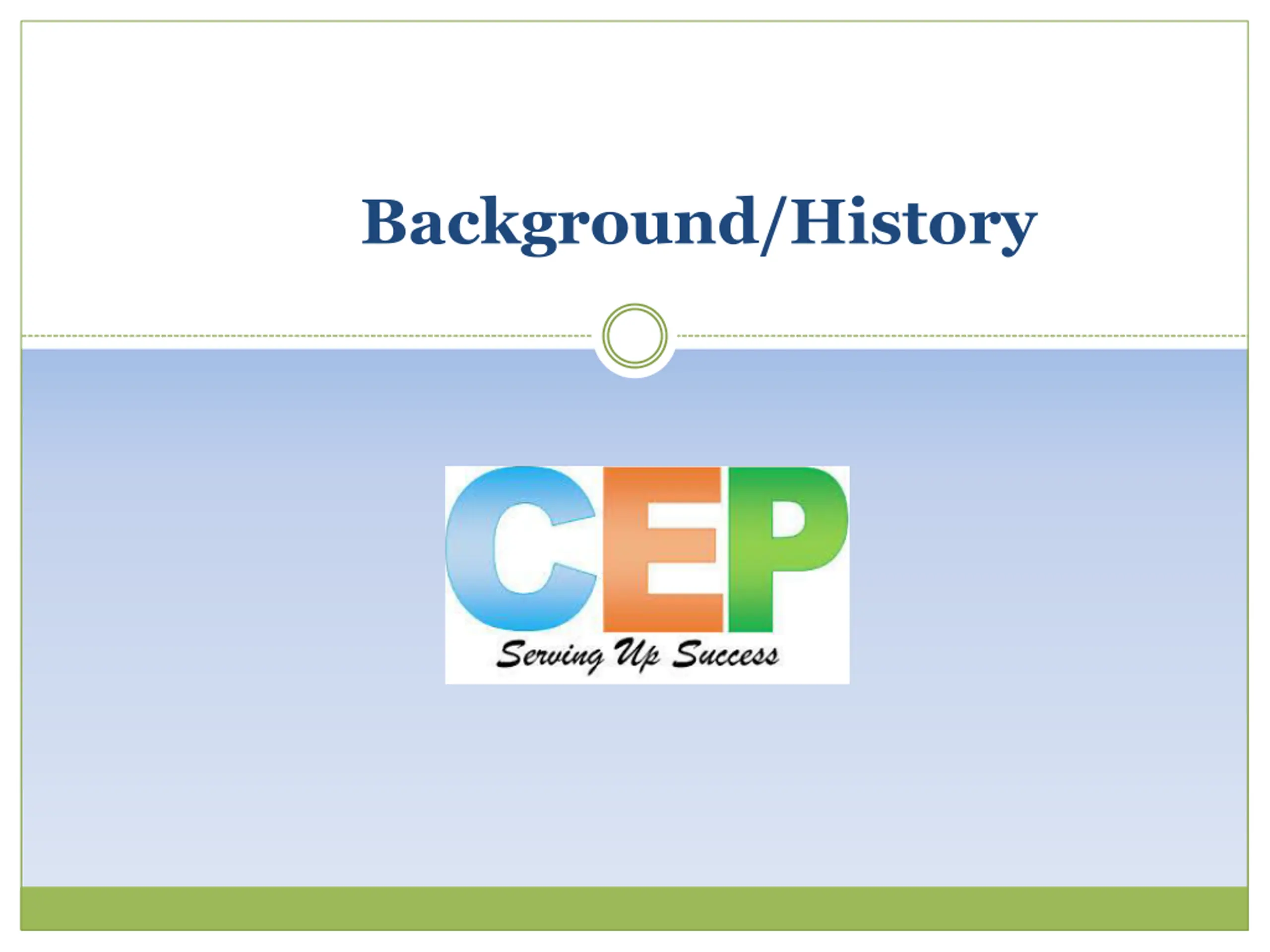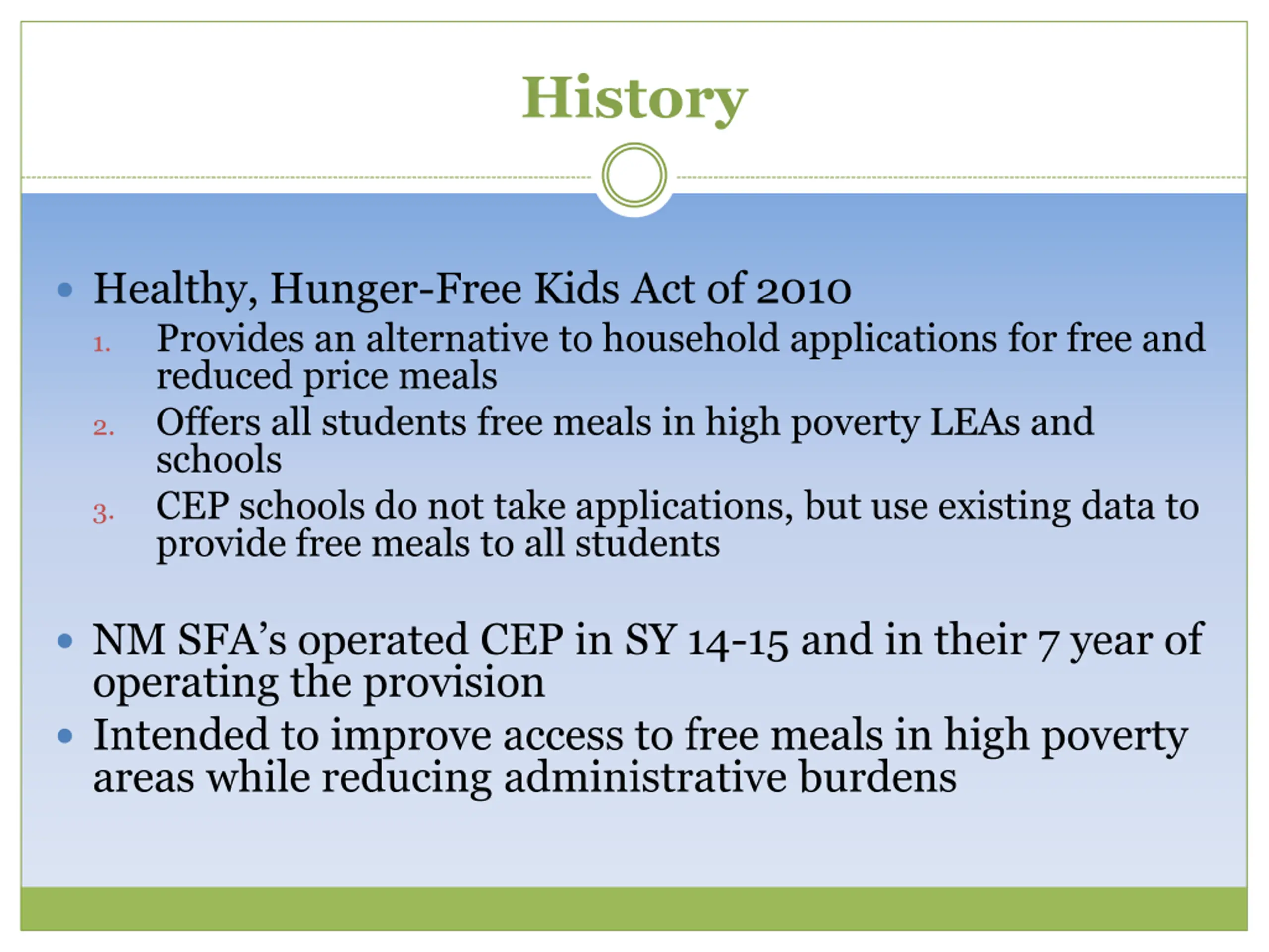 History Healthy, Hunger-Free Kids Act of 2010 1. Provides an alternative to household applications for free and reduced price meals 2. Offers all students free meals in high poverty LEAs and schools 3. CEP schools do not take applications, but use existing data to provide free meals to all students NM SFA s operated CEP in SY 14-15 and in their 7 year of operating the provision Intended to improve access to free meals in high poverty areas while reducing administrative burdens