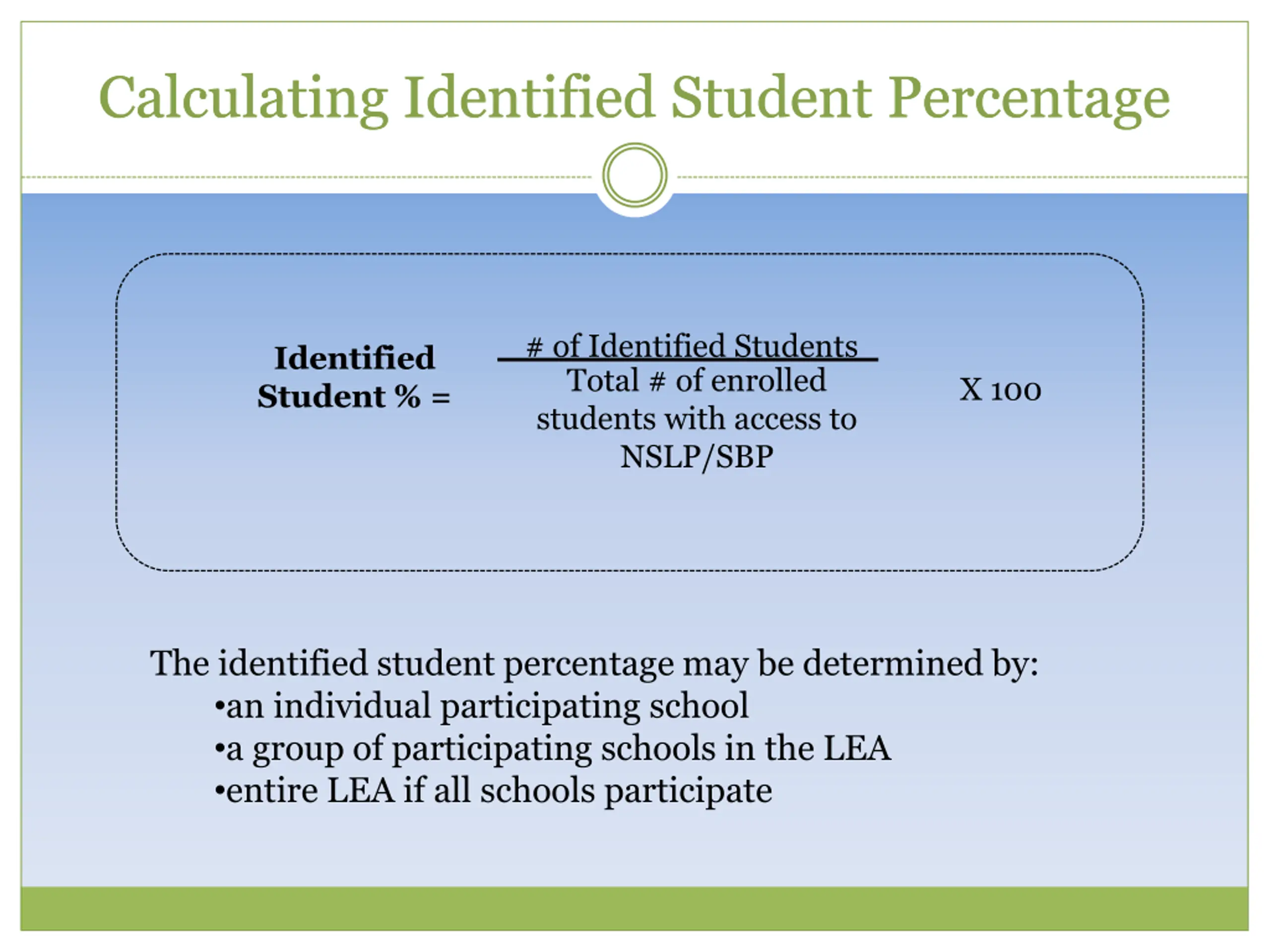 Calculating Identified Student Percentage Calculating Identified Student Percentage # of Identified Students Total # of enrolled students with access to NSLP/SBP Identified Student % = X 100 The identified student percentage may be determined by: an individual participating school a group of participating schools in the LEA entire LEA if all schools participate