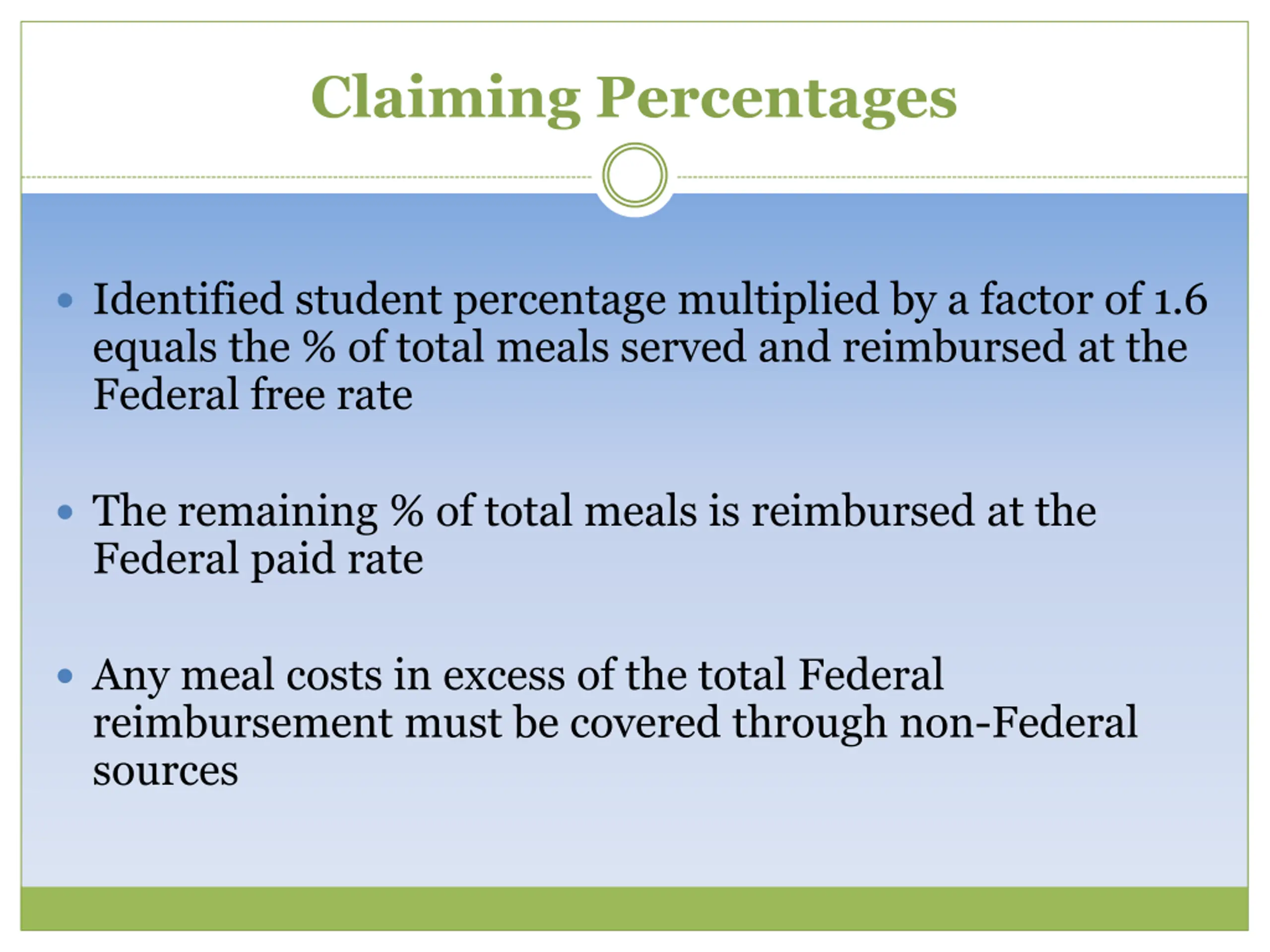 Claiming Percentages Identified student percentage multiplied by a factor of 1.6 equals the % of total meals served and reimbursed at the Federal free rate The remaining % of total meals is reimbursed at the Federal paid rate Any meal costs in excess of the total Federal reimbursement must be covered through non-Federal sources