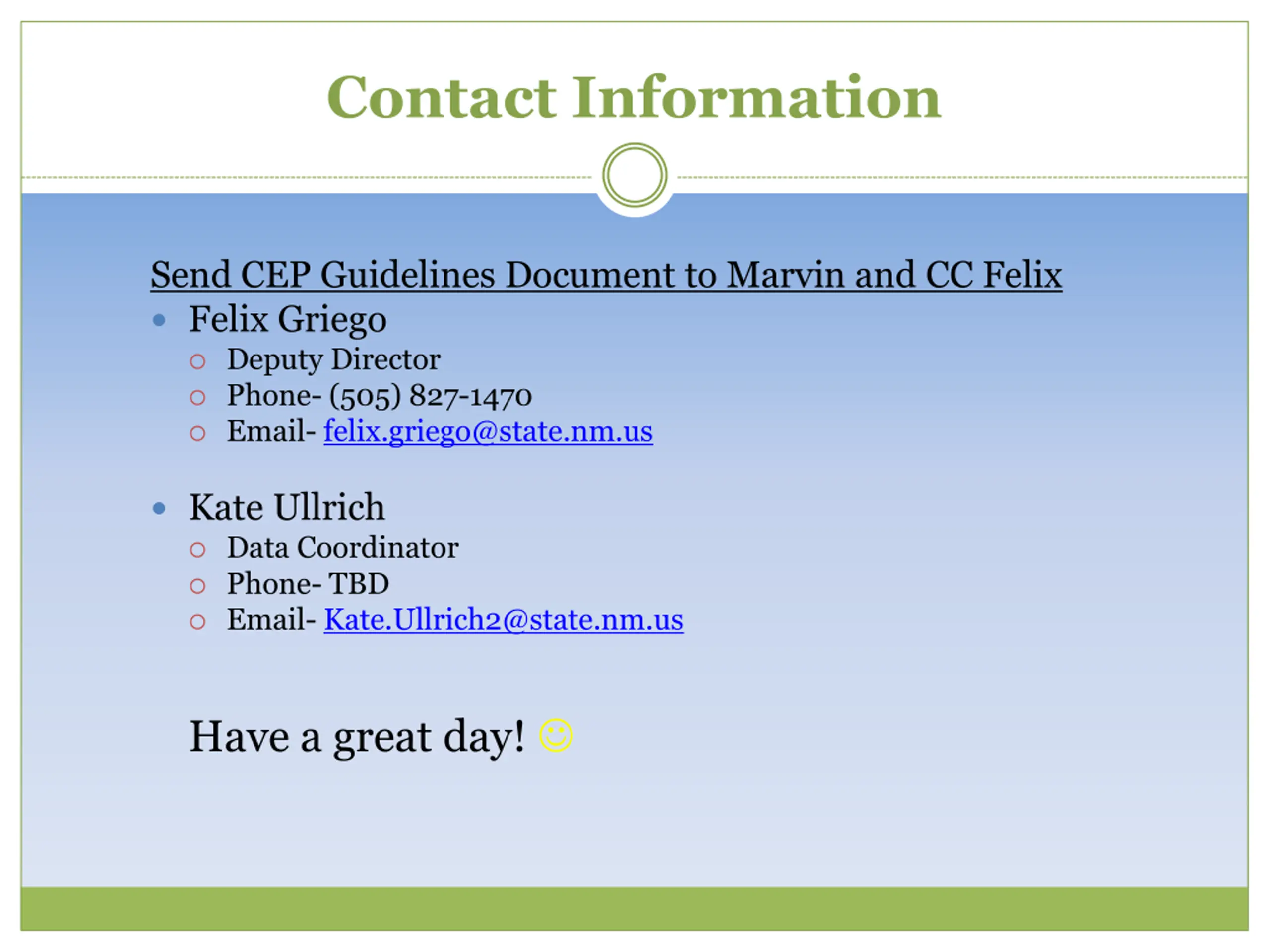 Contact Information Send CEP Guidelines Document to Marvin and CC Felix Felix Griego Deputy Director Phone- (505) 827-1470 Email- felix.griego@state.nm.us Kate Ullrich Data Coordinator Phone- TBD Email- Kate.Ullrich2@state.nm.us Have a great day!