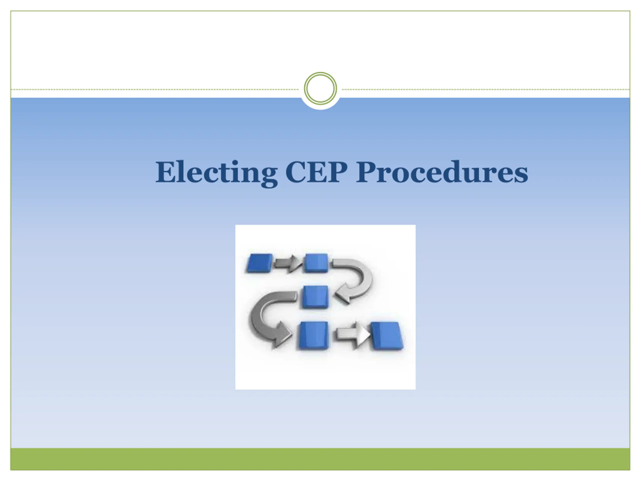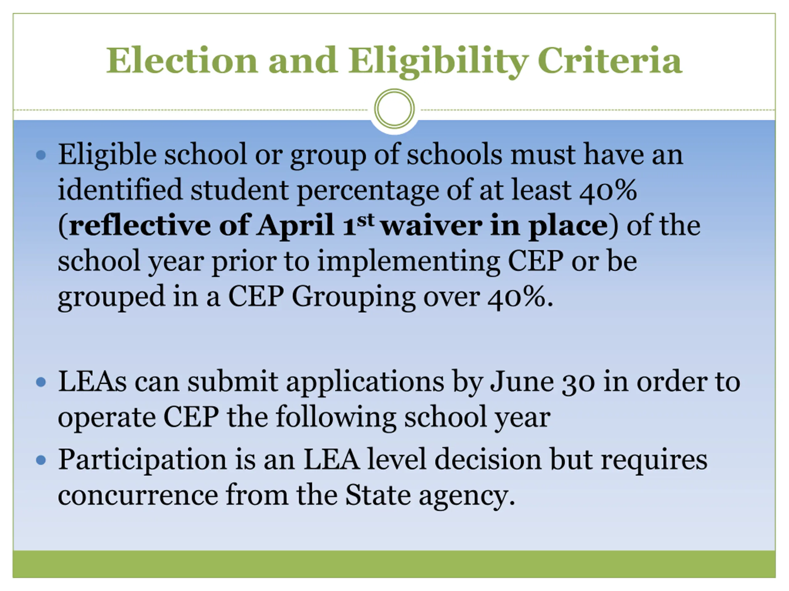 Election and Eligibility Criteria Eligible school or group of schools must have an identified student percentage of at least 40% (reflective of April 1st waiver in place) of the school year prior to implementing CEP or be grouped in a CEP Grouping over 40%. LEAs can submit applications by June 30 in order to operate CEP the following school year Participation is an LEA level decision but requires concurrence from the State agency.