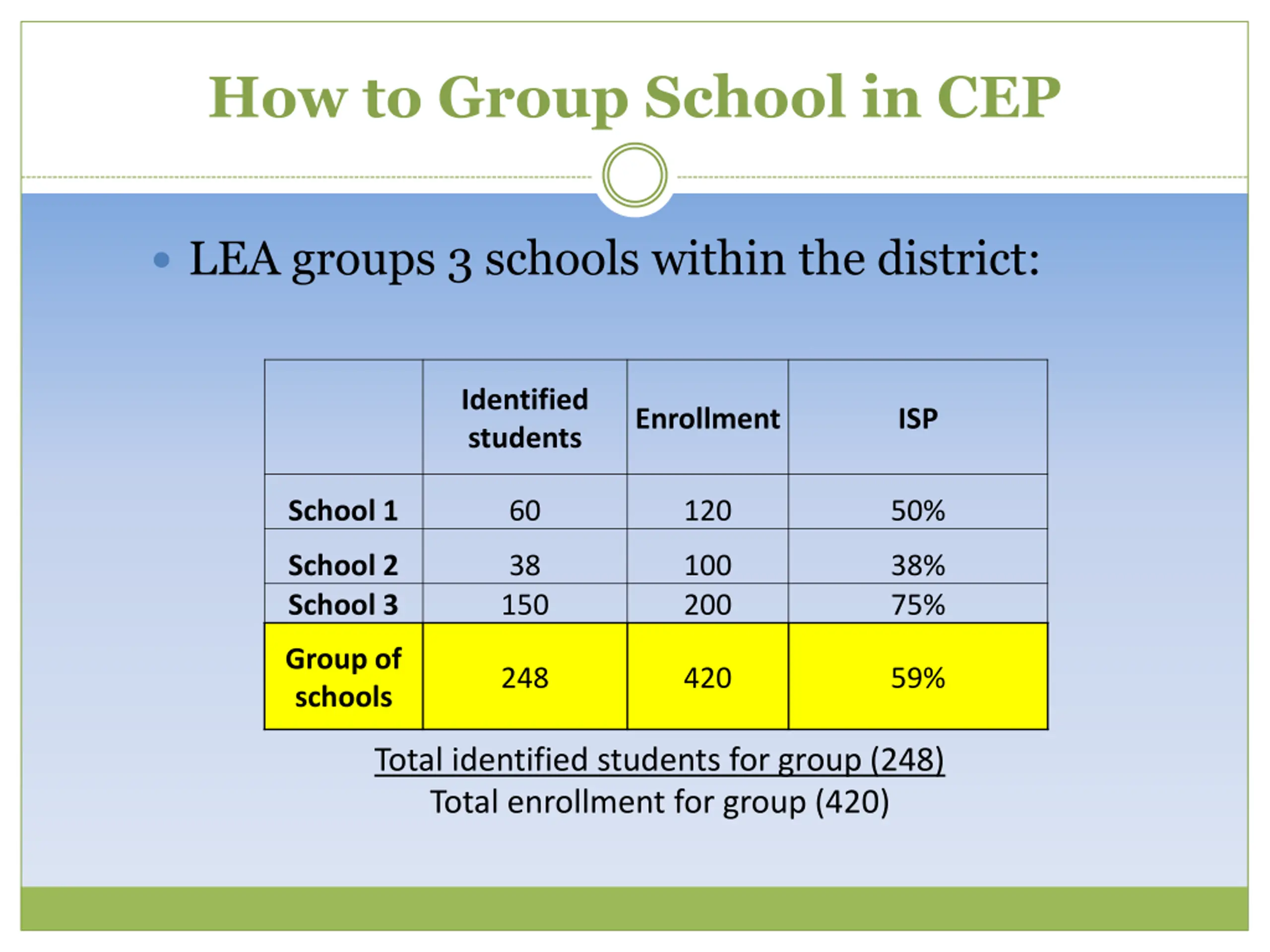 How to Group School in CEP LEA groups 3 schools within the district: Identified students Enrollment ISP School 1 60 120 50% School 2 School 3 38 150 100 200 38% 75% Group of schools 248 420 59% Total identified students for group (248) Total enrollment for group (420)