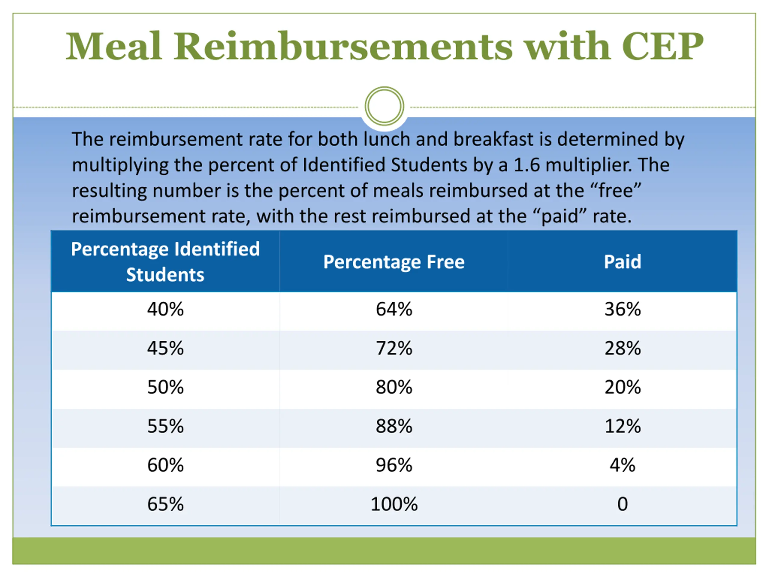 Meal Reimbursements with CEP The reimbursement rate for both lunch and breakfast is determined by multiplying the percent of Identified Students by a 1.6 multiplier. The resulting number is the percent of meals reimbursed at the free reimbursement rate, with the rest reimbursed at the paid rate. Percentage Identified Students Percentage Free Paid 40% 64% 36% 45% 72% 28% 50% 80% 20% 55% 88% 12% 60% 96% 4% 65% 100% 0