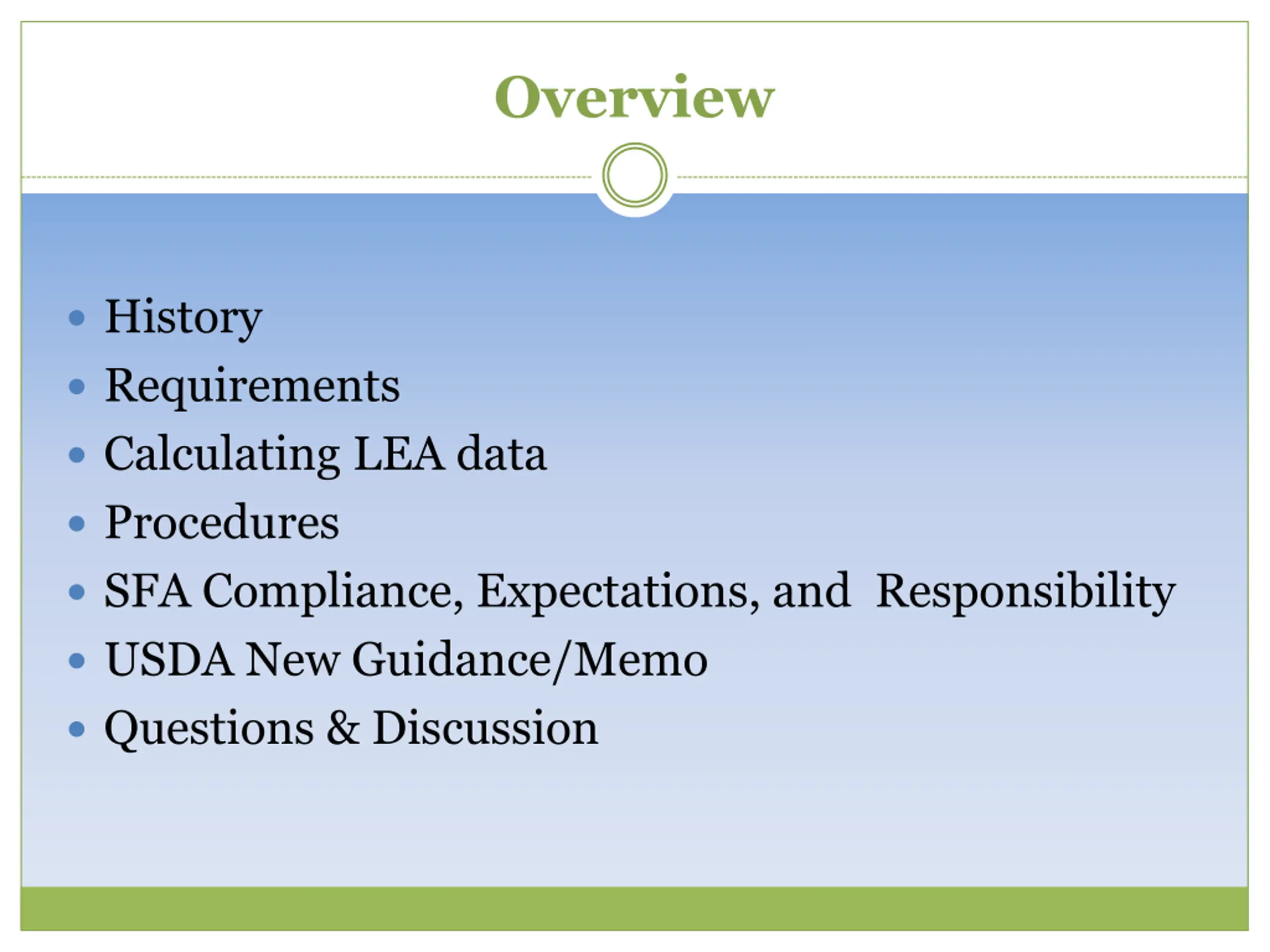 Overview History Requirements Calculating LEA data Procedures SFA Compliance, Expectations, and Responsibility USDA New Guidance/Memo Questions & Discussion