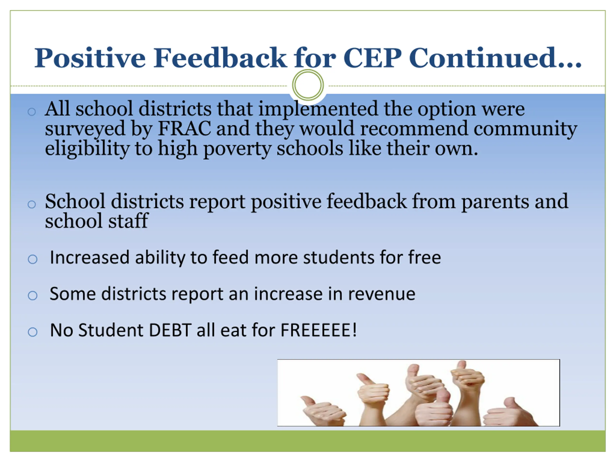 Positive Feedback for CEP Continued o All school districts that implemented the option were surveyed by FRAC and they would recommend community eligibility to high poverty schools like their own. o School districts report positive feedback from parents and school staff o Increased ability to feed more students for free o Some districts report an increase in revenue o No Student DEBT all eat for FREEEEE! http://www.coachingacademyblog.com/wp-content/the-power-of-positive-feedback-by-julie-hickton.jpg