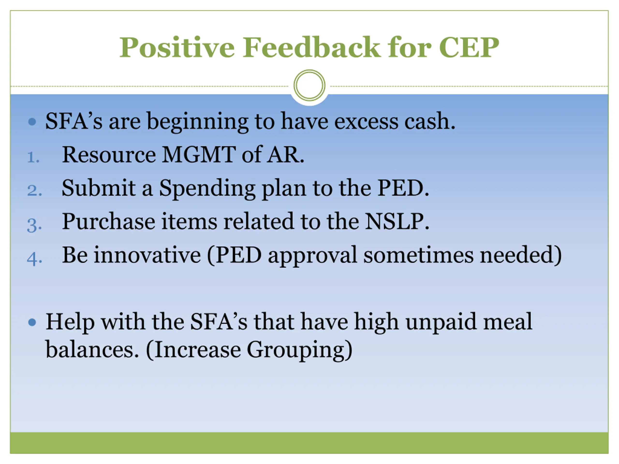Positive Feedback for CEP SFA s are beginning to have excess cash. Resource MGMT of AR. 2. Submit a Spending plan to the PED. 3. Purchase items related to the NSLP. 4. Be innovative (PED approval sometimes needed) 1. Help with the SFA s that have high unpaid meal balances. (Increase Grouping)