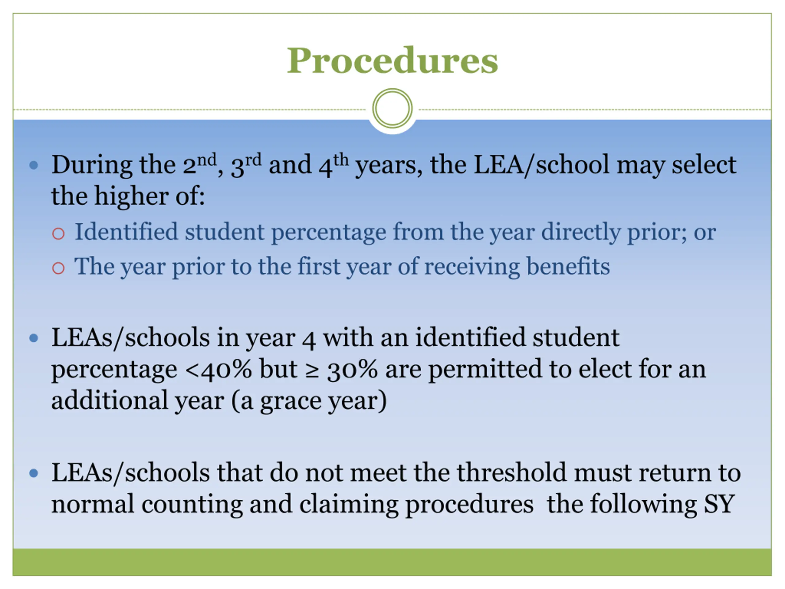 Procedures During the 2nd, 3rd and 4th years, the LEA/school may select the higher of: Identified student percentage from the year directly prior; or The year prior to the first year of receiving benefits LEAs/schools in year 4 with an identified student percentage <40% but 30% are permitted to elect for an additional year (a grace year) LEAs/schools that do not meet the threshold must return to normal counting and claiming procedures the following SY