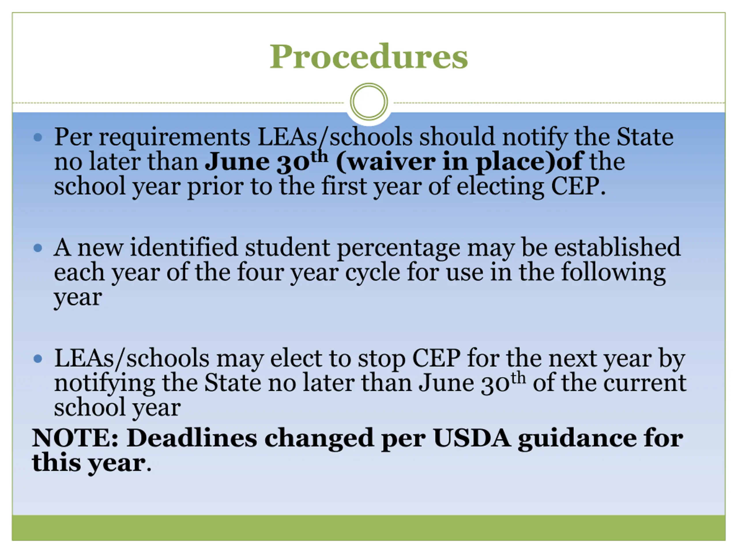 Procedures Per requirements LEAs/schools should notify the State no later than June 30th (waiver in place)of the school year prior to the first year of electing CEP. A new identified student percentage may be established each year of the four year cycle for use in the following year LEAs/schools may elect to stop CEP for the next year by notifying the State no later than June 30th of the current school year NOTE: Deadlines changed per USDA guidance for this year.