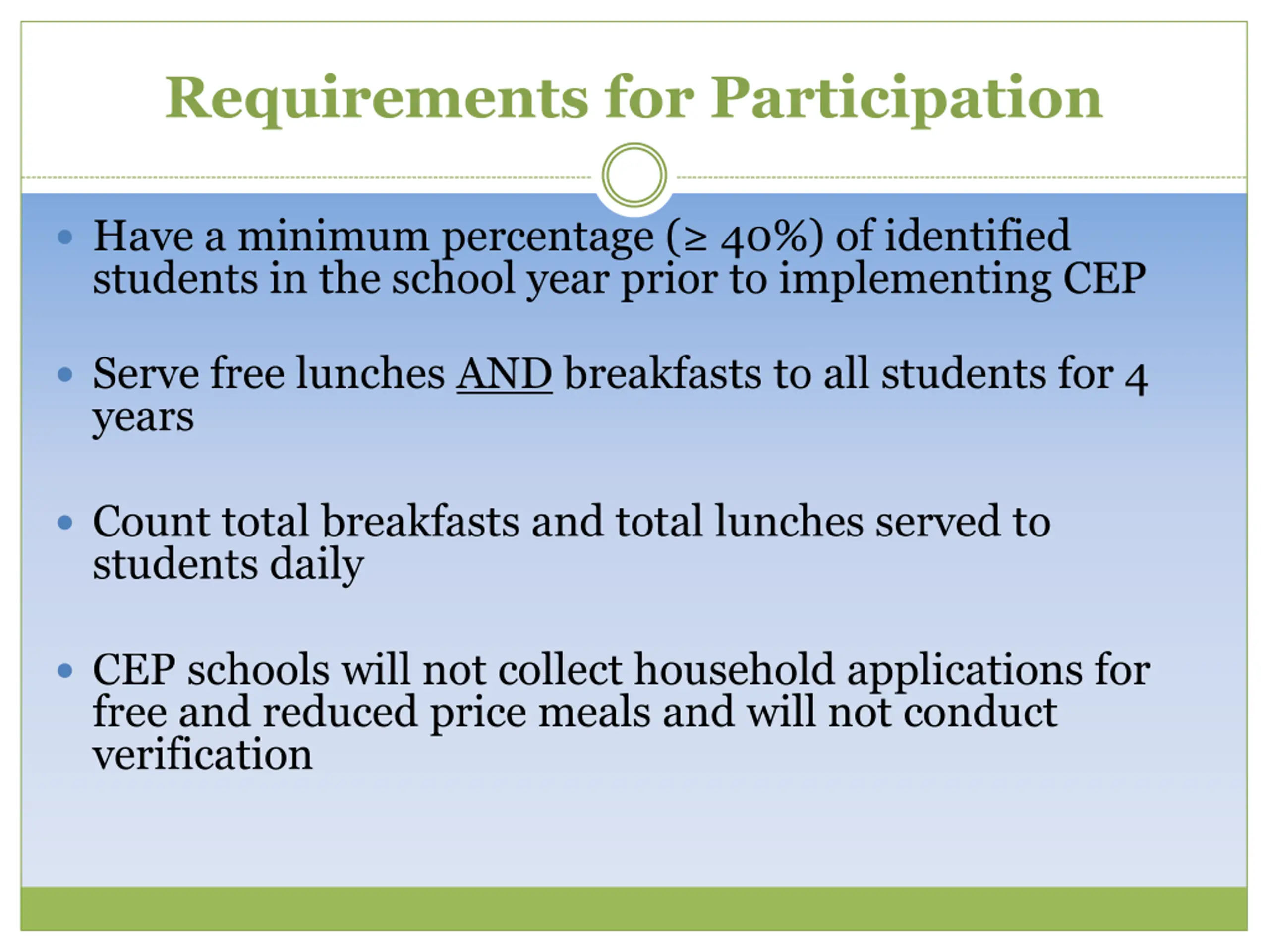 Requirements for Participation Have a minimum percentage ( 40%) of identified students in the school year prior to implementing CEP Serve free lunches AND breakfasts to all students for 4 years Count total breakfasts and total lunches served to students daily CEP schools will not collect household applications for free and reduced price meals and will not conduct verification