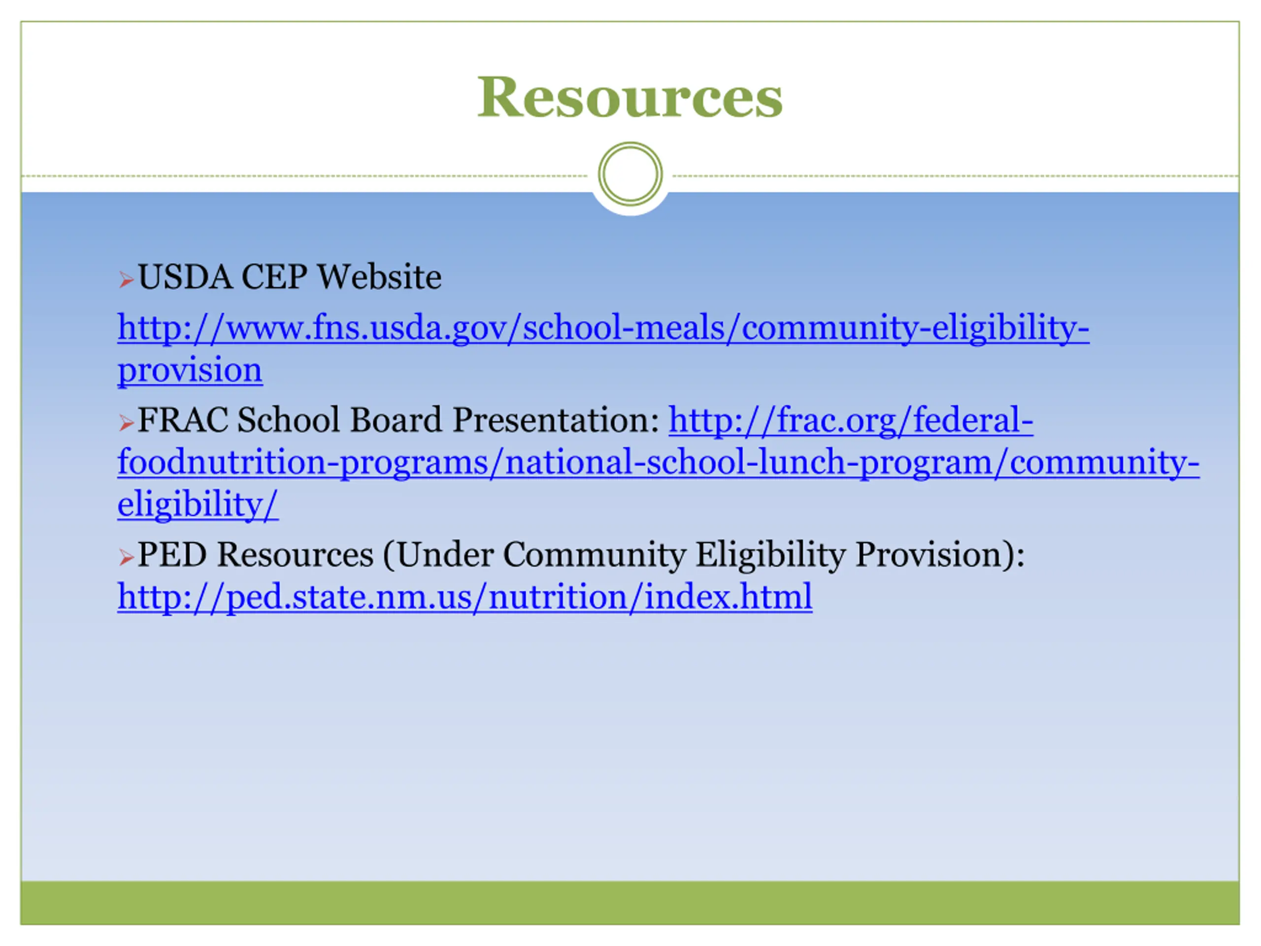 Resources USDA CEP Website http://www.fns.usda.gov/school-meals/community-eligibility- provision FRAC School Board Presentation: http://frac.org/federal- foodnutrition-programs/national-school-lunch-program/community- eligibility/ PED Resources (Under Community Eligibility Provision): http://ped.state.nm.us/nutrition/index.html