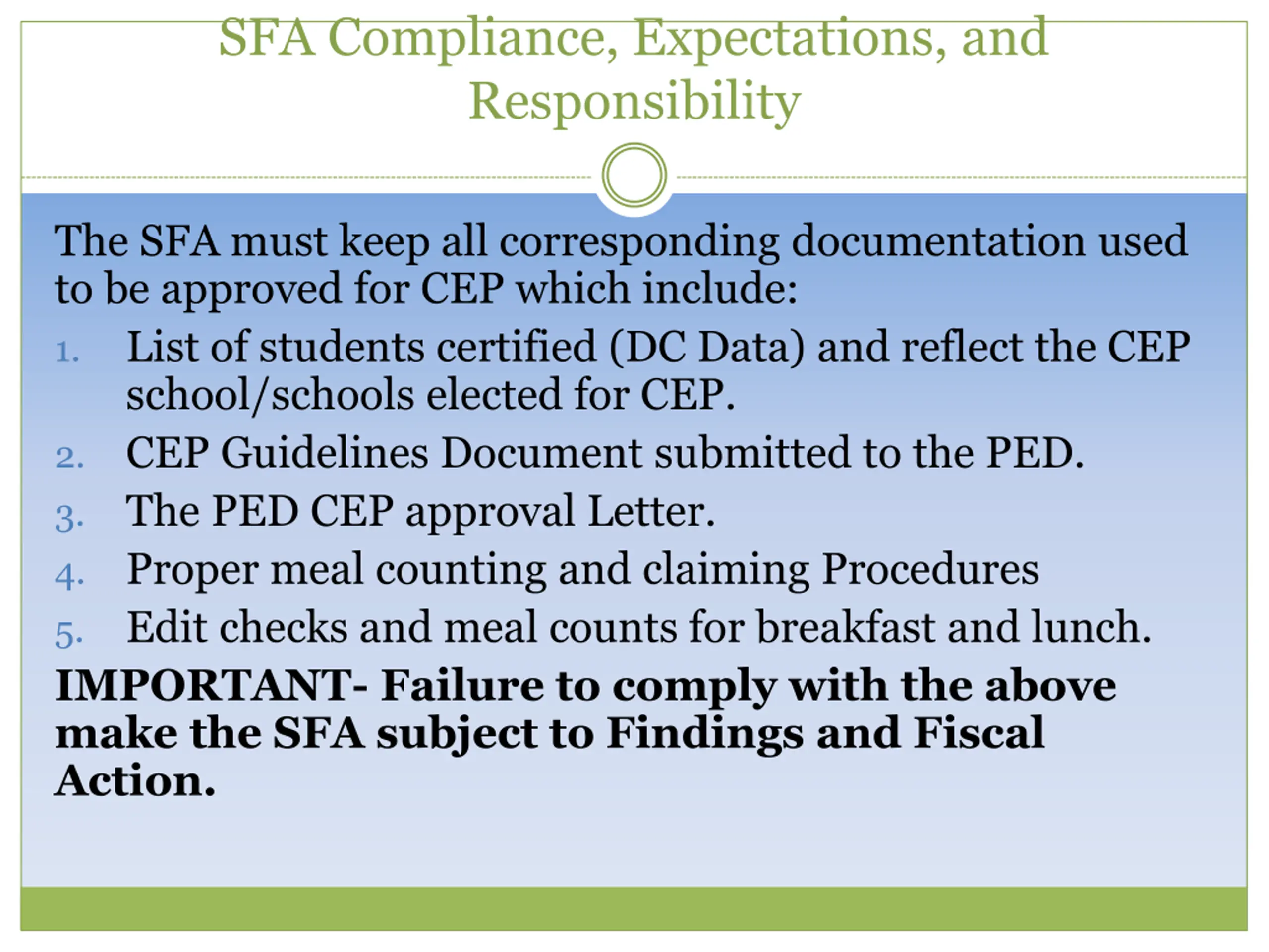 SFA Compliance, Expectations, and Responsibility The SFA must keep all corresponding documentation used to be approved for CEP which include: 1. List of students certified (DC Data) and reflect the CEP school/schools elected for CEP. 2. CEP Guidelines Document submitted to the PED. 3. The PED CEP approval Letter. 4. Proper meal counting and claiming Procedures 5. Edit checks and meal counts for breakfast and lunch. IMPORTANT- Failure to comply with the above make the SFA subject to Findings and Fiscal Action.