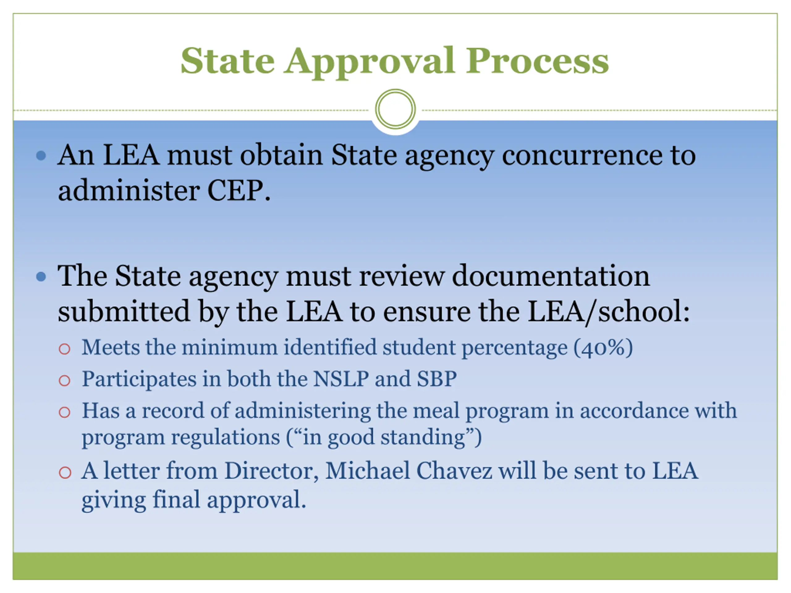 State Approval Process An LEA must obtain State agency concurrence to administer CEP. The State agency must review documentation submitted by the LEA to ensure the LEA/school: Meets the minimum identified student percentage (40%) Participates in both the NSLP and SBP Has a record of administering the meal program in accordance with program regulations ( in good standing ) A letter from Director, Michael Chavez will be sent to LEA giving final approval.