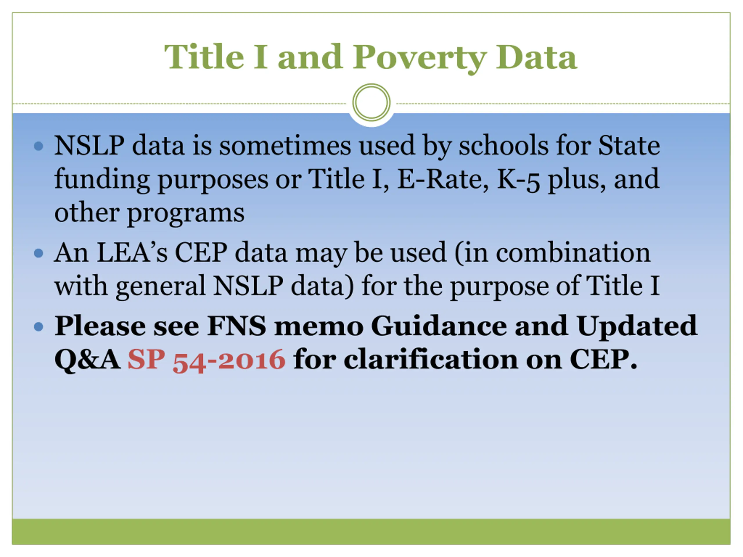 Title I and Poverty Data NSLP data is sometimes used by schools for State funding purposes or Title I, E-Rate, K-5 plus, and other programs An LEA s CEP data may be used (in combination with general NSLP data) for the purpose of Title I Please see FNS memo Guidance and Updated Q&A SP 54-2016 for clarification on CEP.