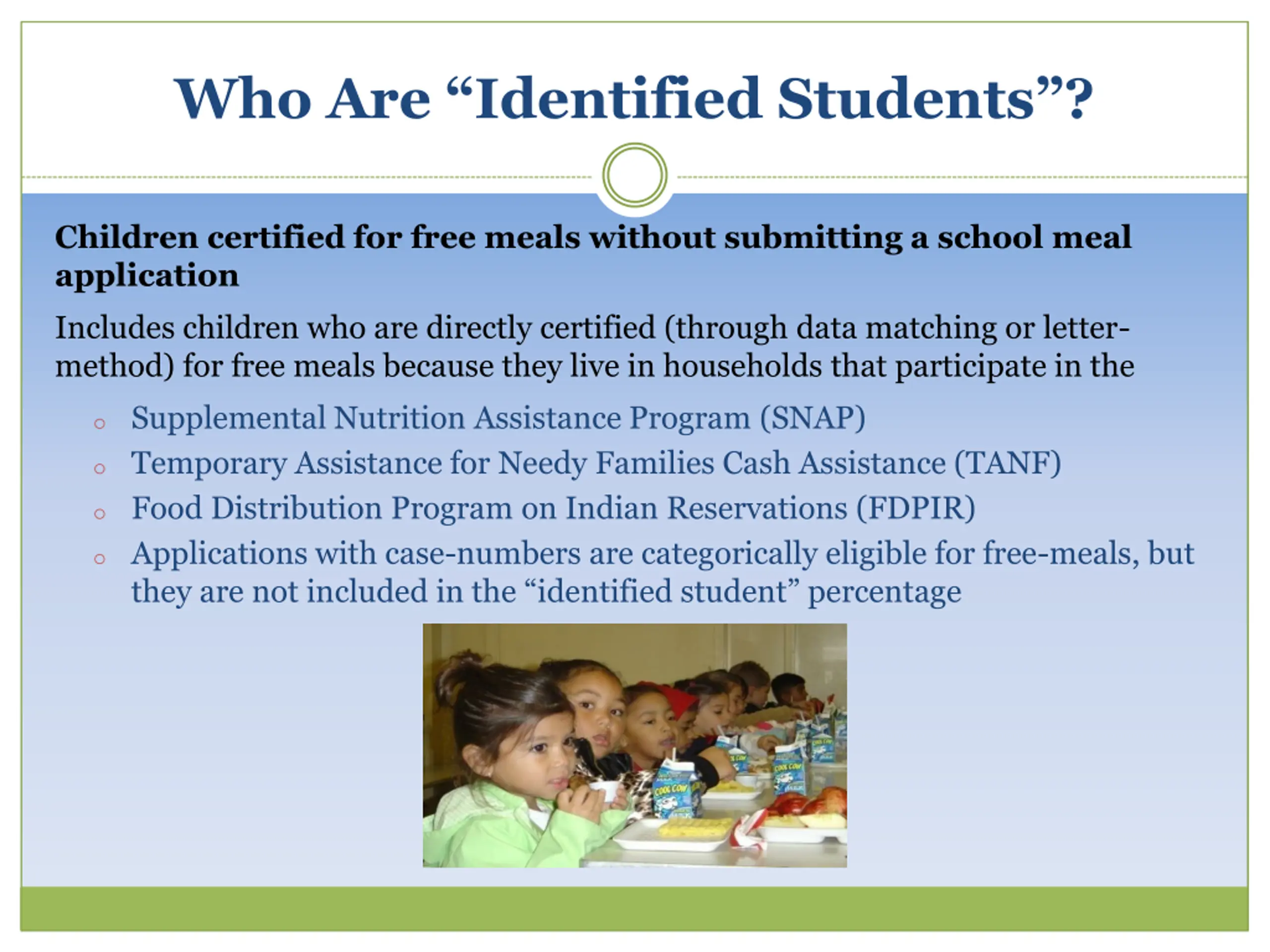 Who Are Identified Students? Children certified for free meals without submitting a school meal application Includes children who are directly certified (through data matching or letter- method) for free meals because they live in households that participate in the o Supplemental Nutrition Assistance Program (SNAP) o Temporary Assistance for Needy Families Cash Assistance (TANF) o Food Distribution Program on Indian Reservations (FDPIR) o Applications with case-numbers are categorically eligible for free-meals, but they are not included in the identified student percentage